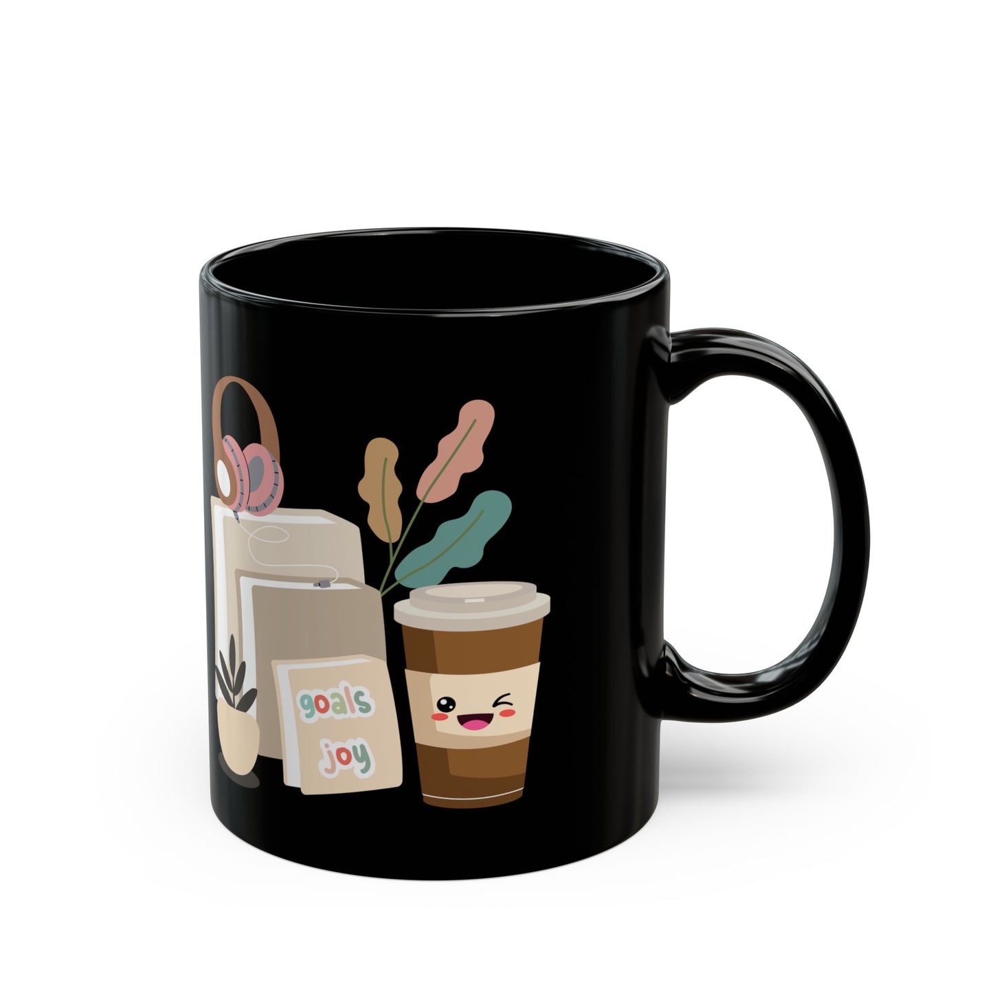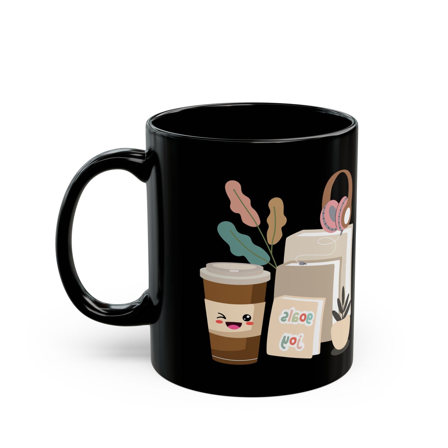 Discover the perfect black coffee mug for readers and java junkies! This sleek cup features a cozy print of books, a steaming coffee cup, and headphones. Book lovers are raving about this design. The dark background makes the bookish illustration pop, adding style to your reading nook.