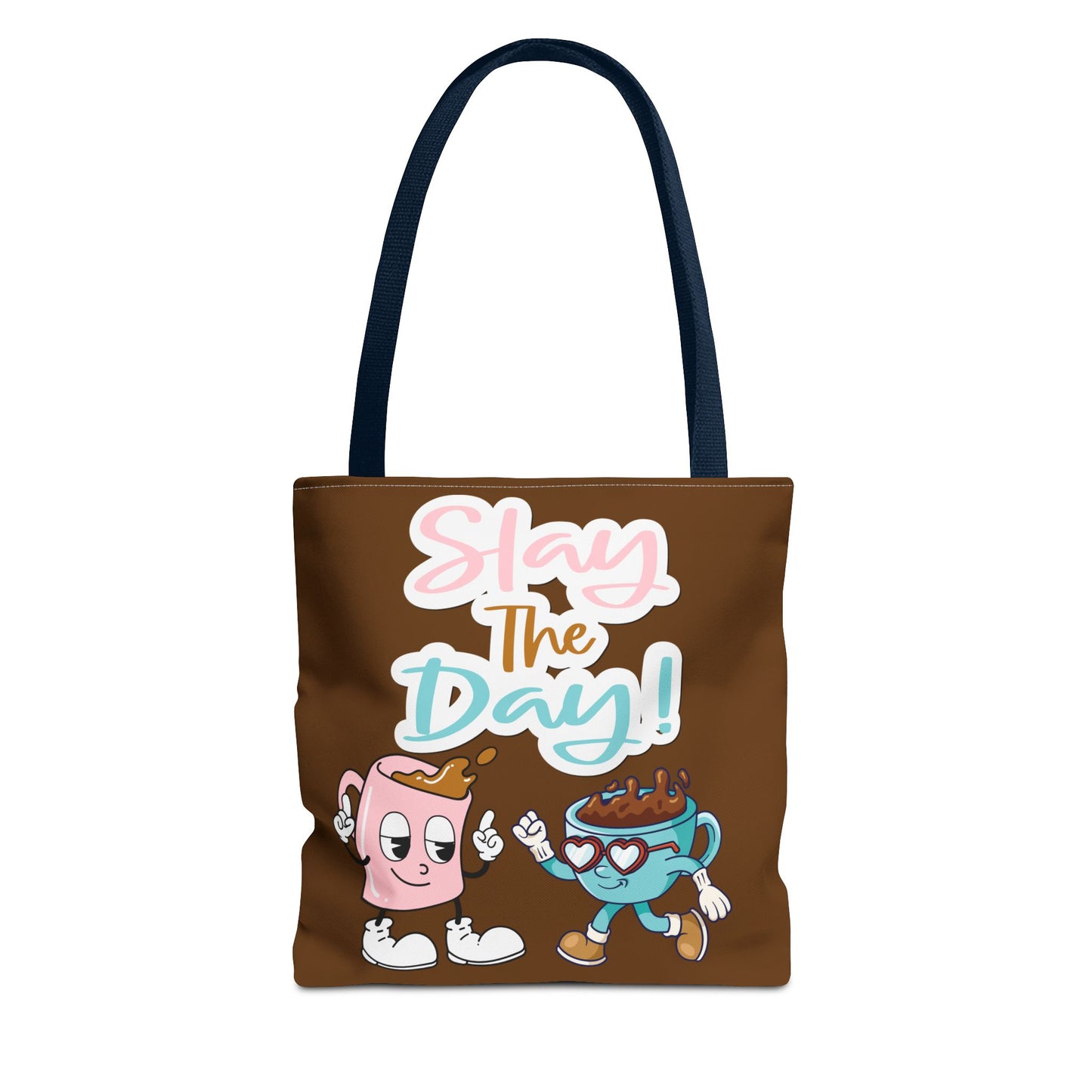 Explore this trendy coffee tote bag showcasing adorable pink and light blue coffee mugs, crowned with the empowering phrase "Slay The Day". Perfect for coffee lovers seeking daily motivation and style.