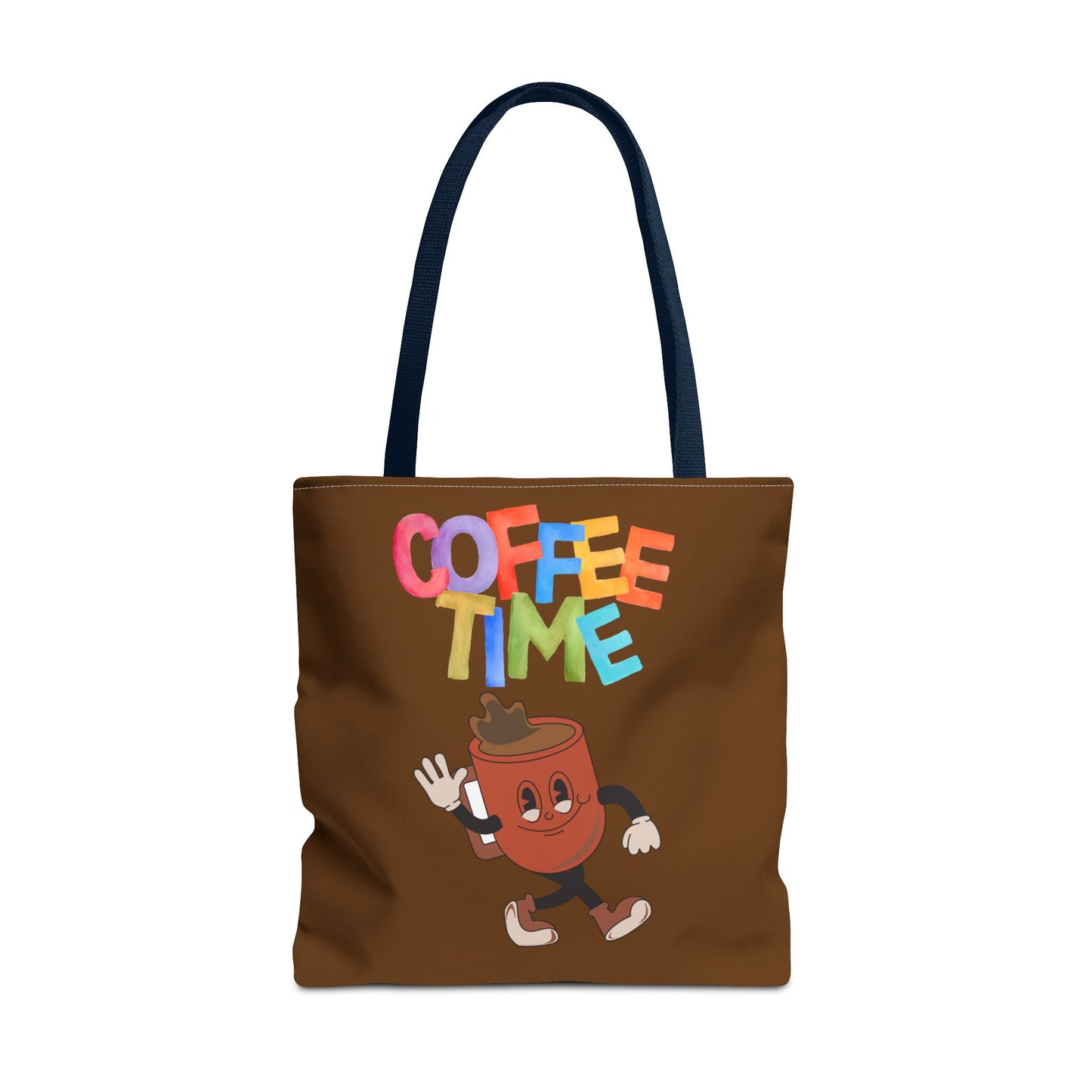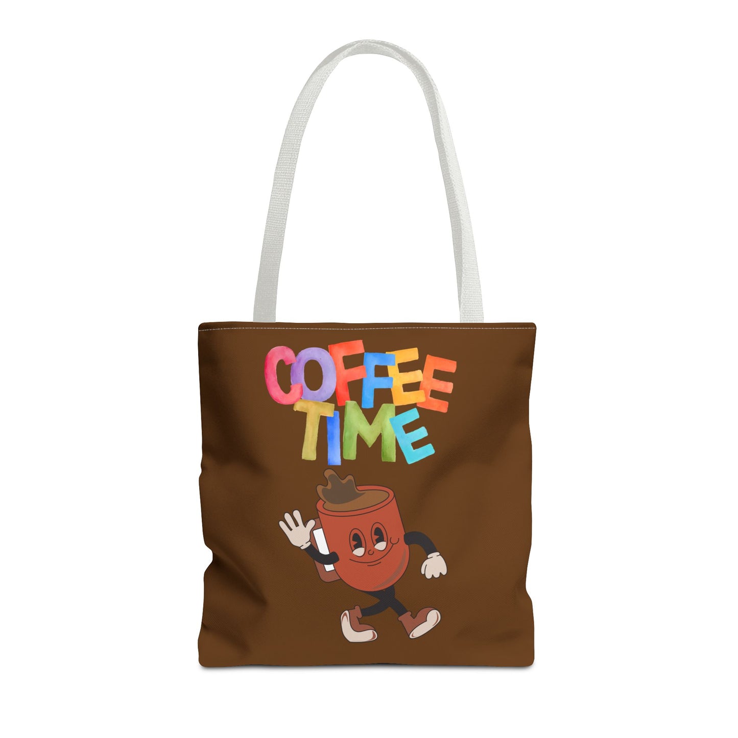 Brighten your day with this fun coffee tote bag. It shows a happy coffee mug waving hello, topped with colorful "Coffee Time" letters.