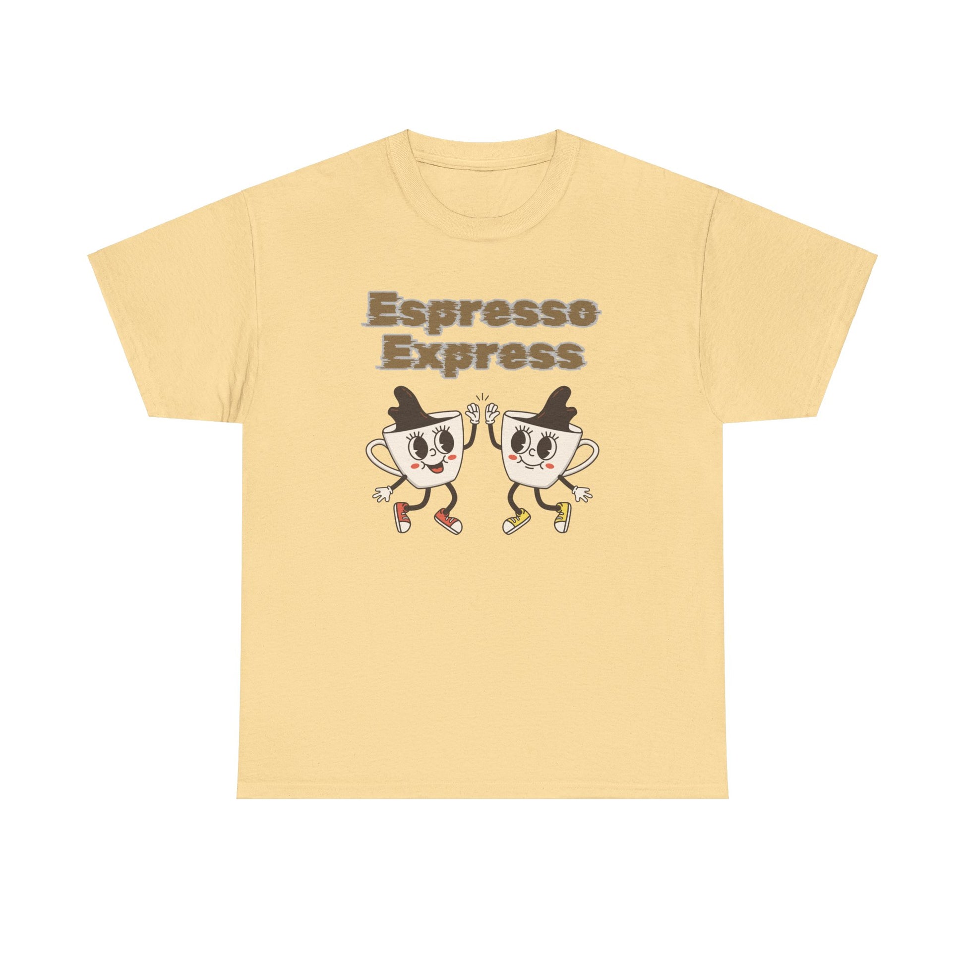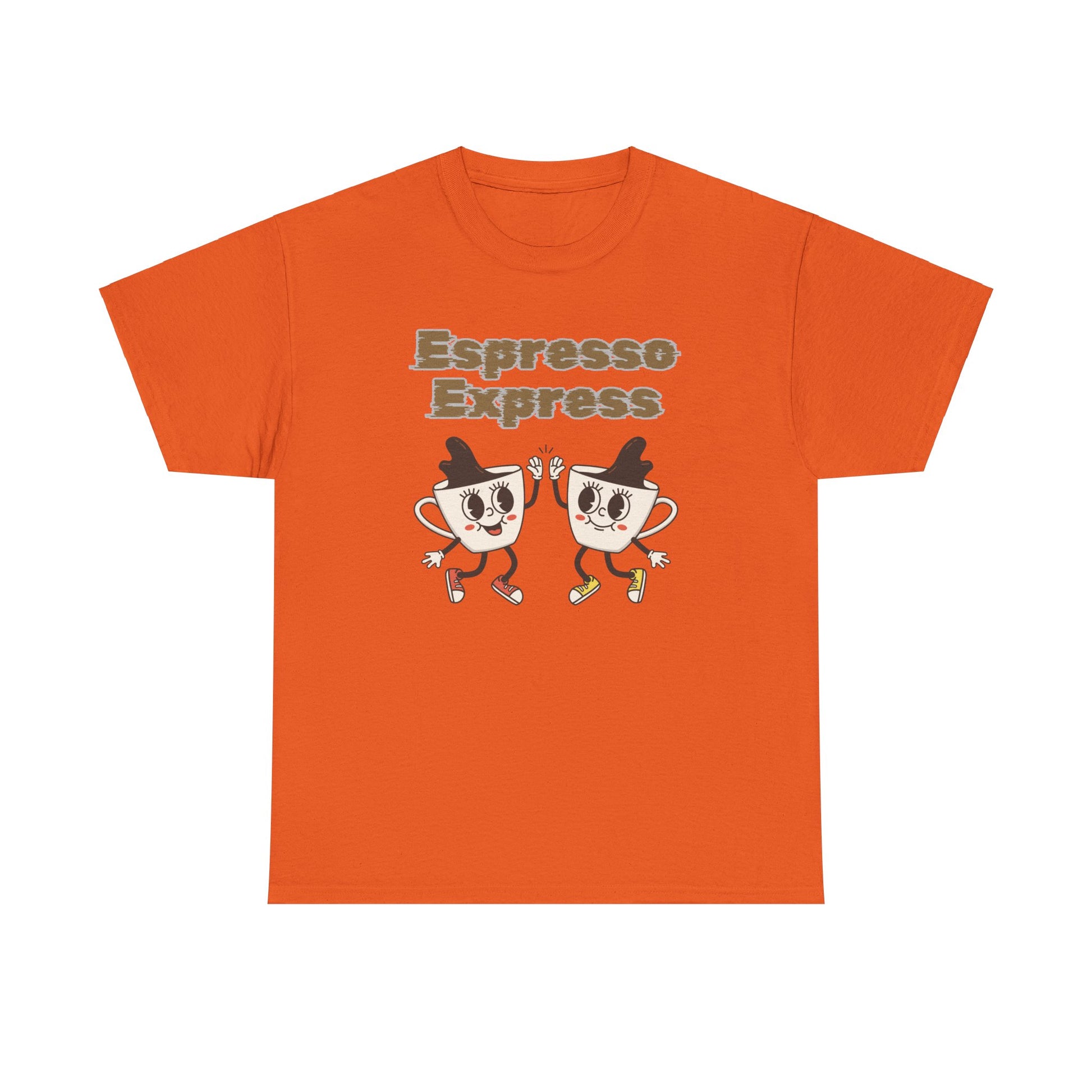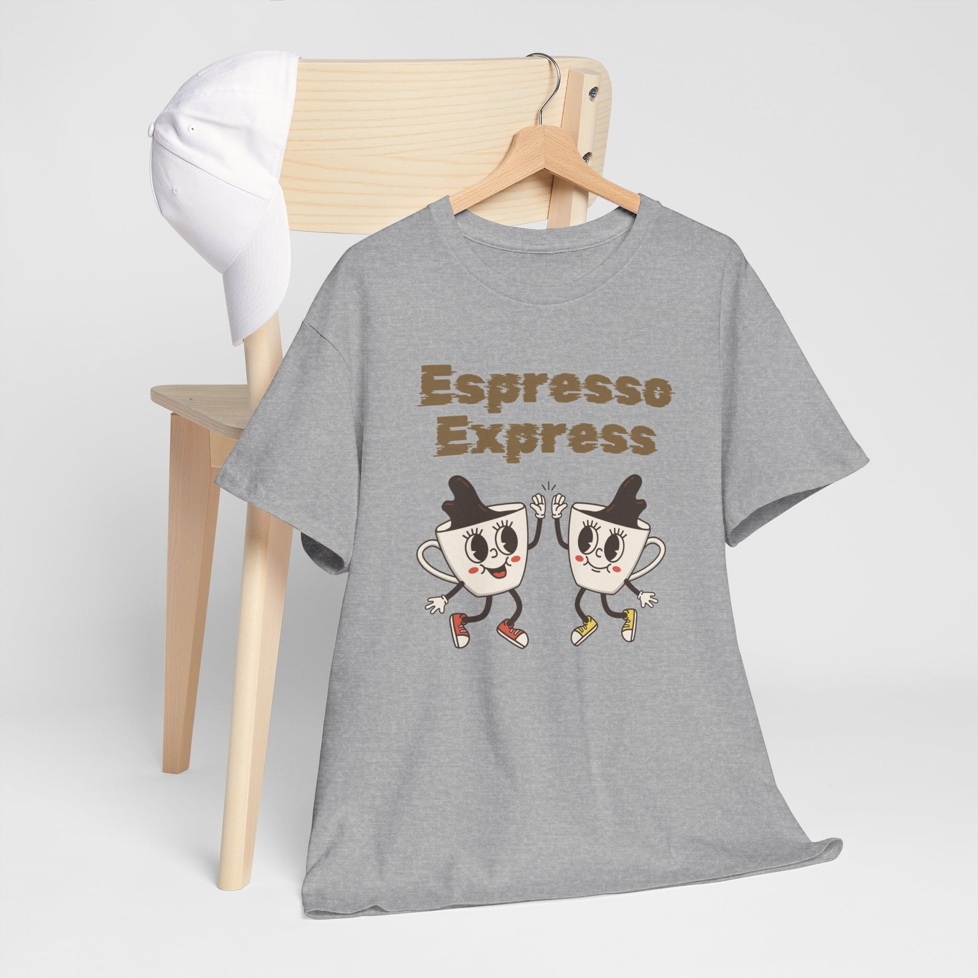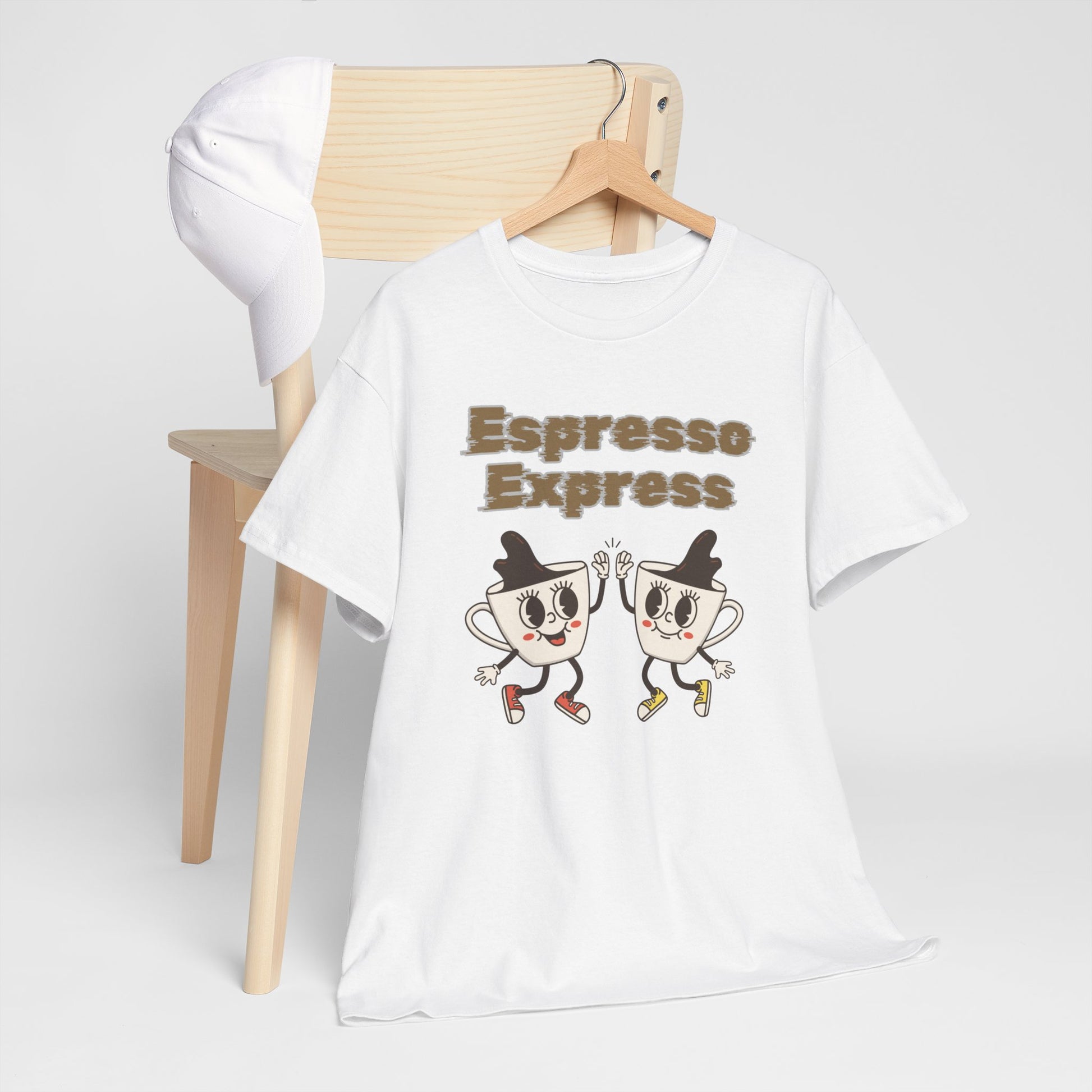 Explore this charming unisex Coffee T-shirt featuring a duo of smiling coffee cups and the energetic "Espresso Express" slogan. Perfect for coffee enthusiasts who love to spread caffeine-fueled cheer.