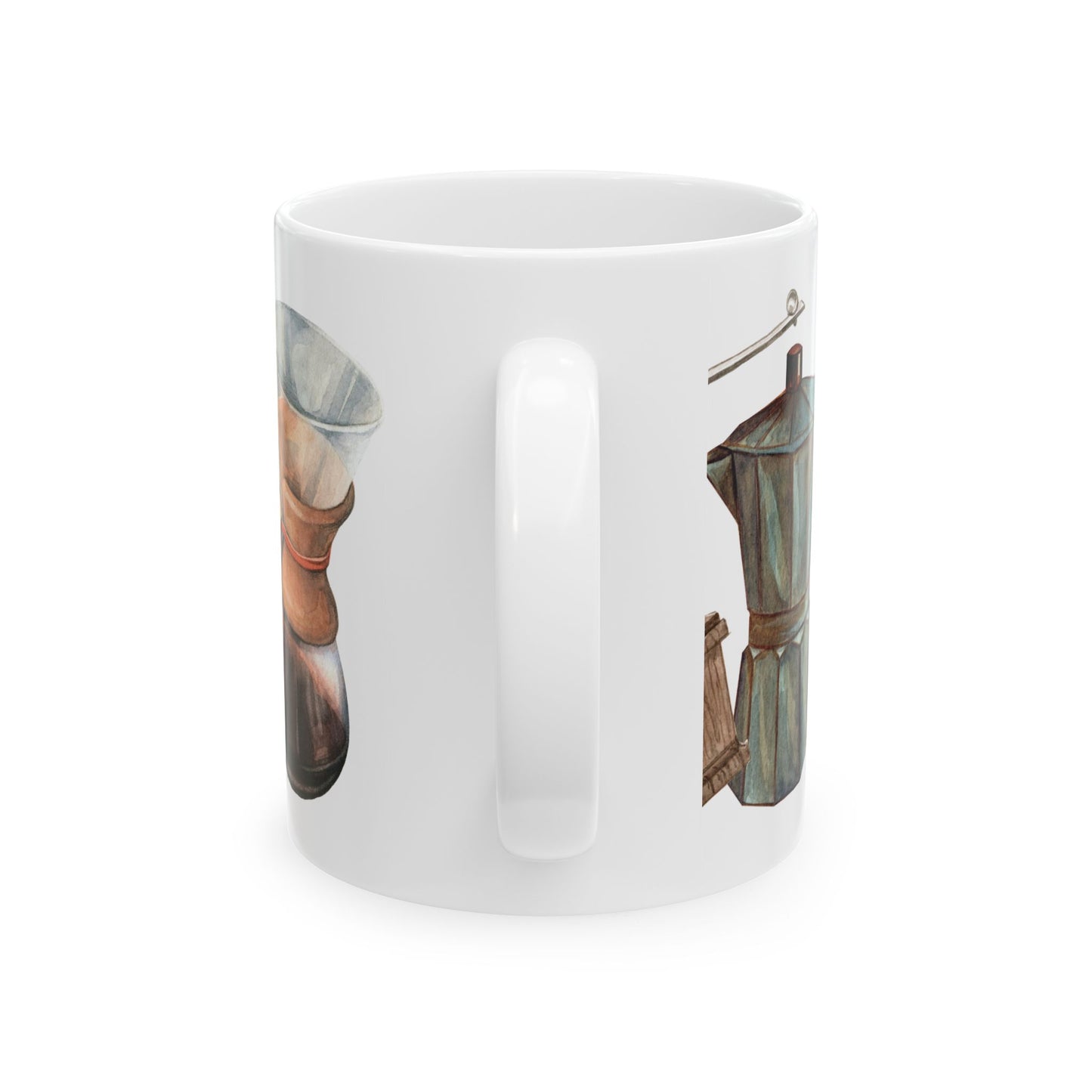 Discover the perfect white coffee mug for manual brewing enthusiasts! This elegant coffee cup showcases a detailed print of a Moka pot, grinder, and Chemex - the holy trinity of artisanal coffee. Coffee connoisseurs are falling for this design. Display your passion for craft coffee with every pour!