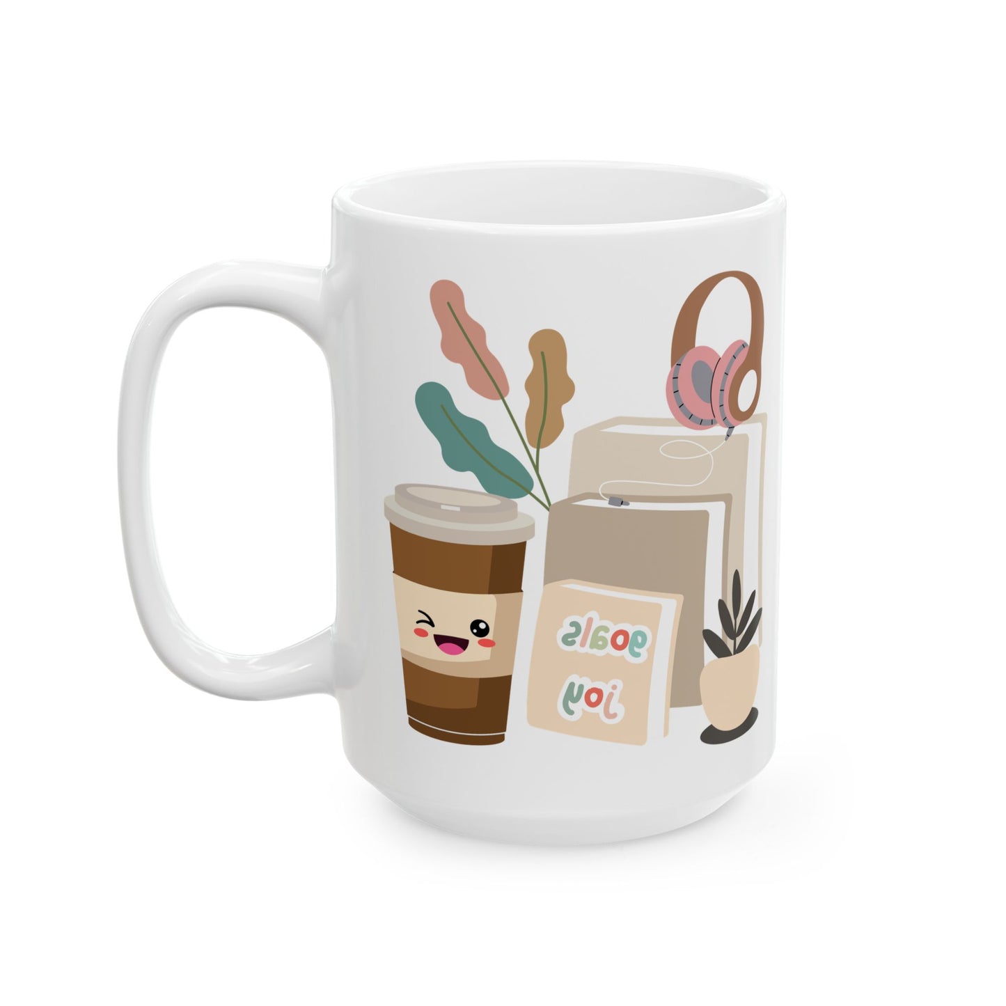 Discover the ideal white coffee mug for book and coffee enthusiasts! This charming cup showcases a cozy print of books, a steaming coffee cup, and headphones. Readers are falling in love with this design. The crisp white background makes the bookish illustration stand out, perfect for your reading ritual.