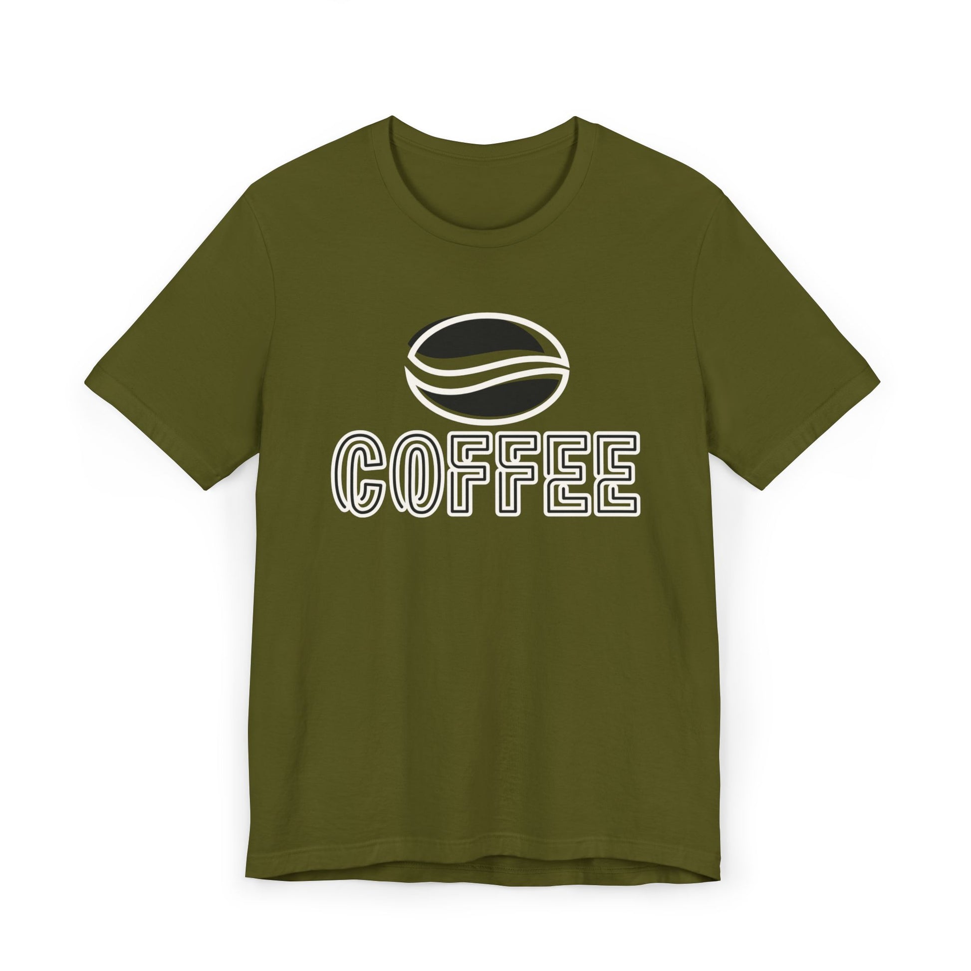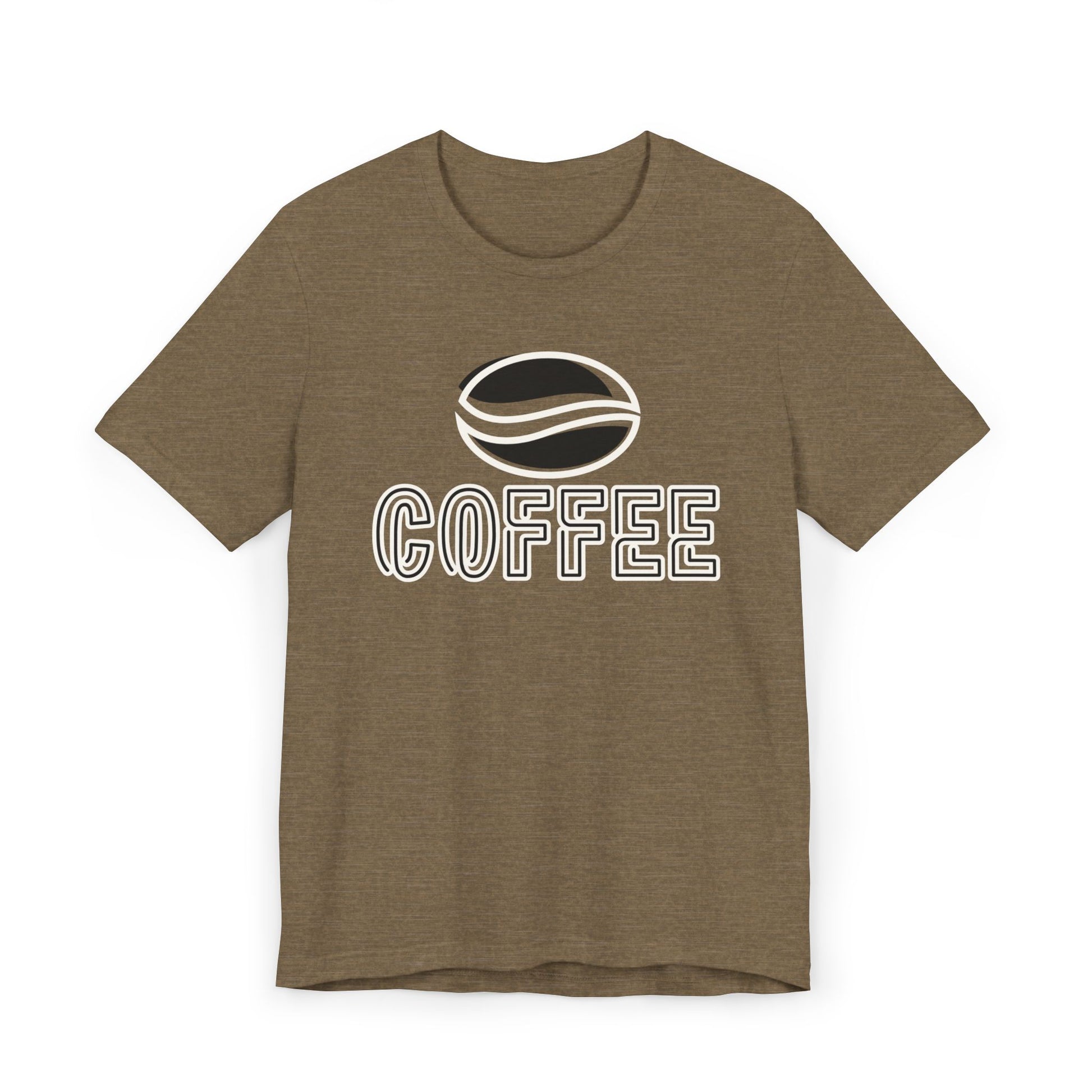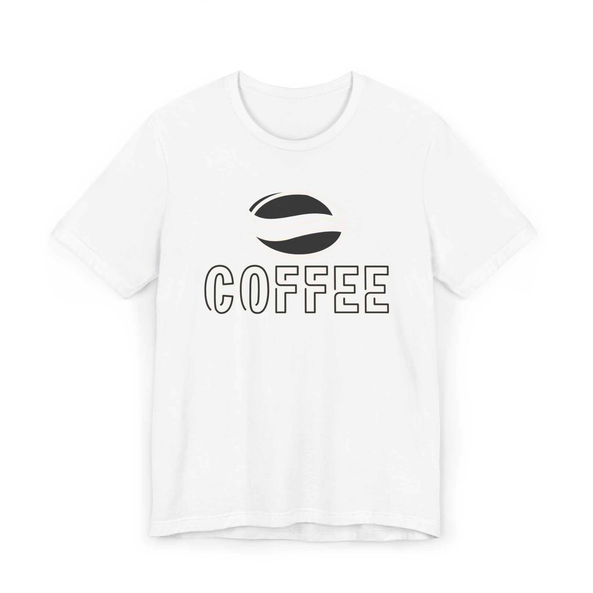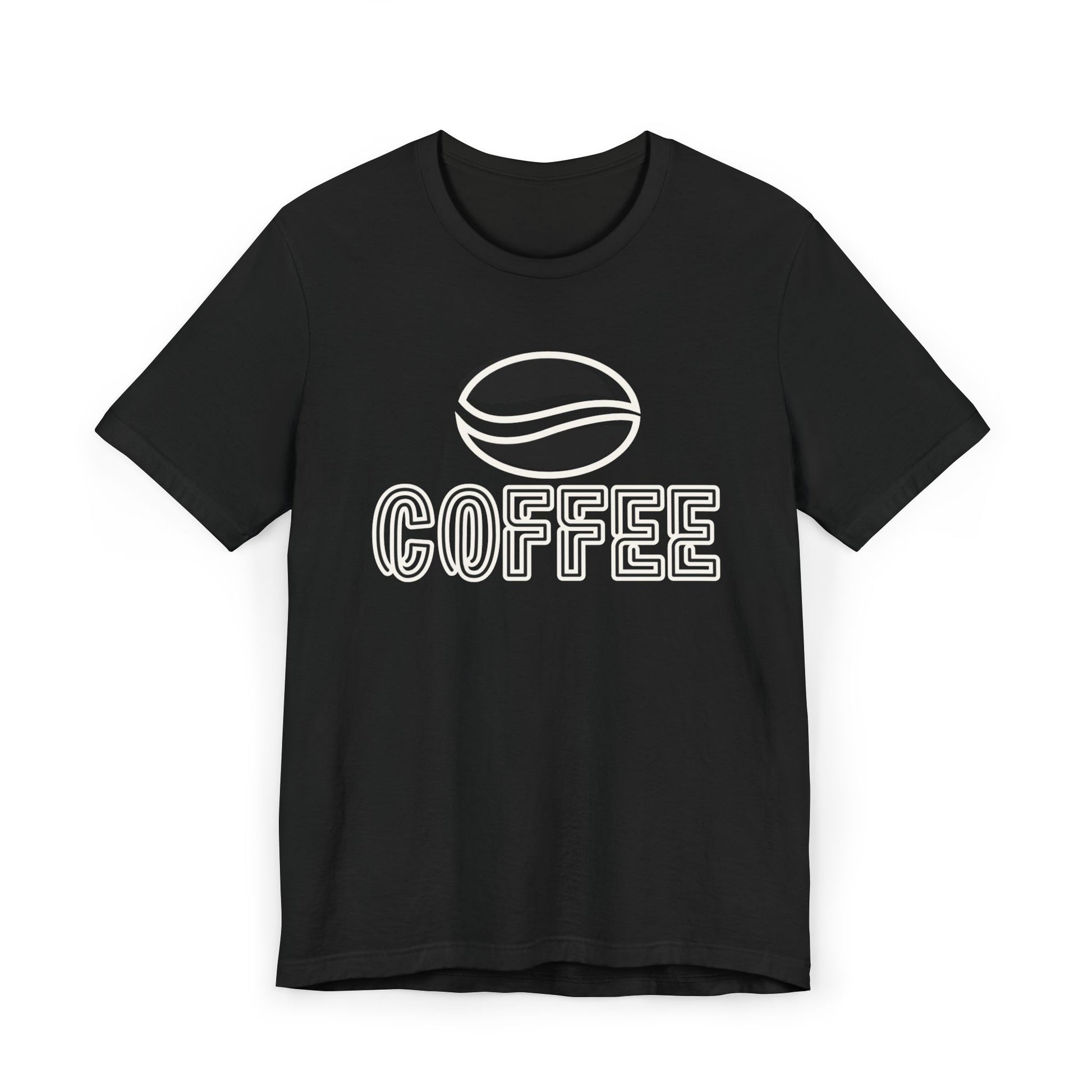The design features a minimalist white coffee bean logo above bold outlined “COFFEE” text, giving it a modern and versatile look. With its classic crew neckline, ribbed knit collar that holds its shape, reinforced shoulders, and side seams for structure, this tee blends comfort with durability.