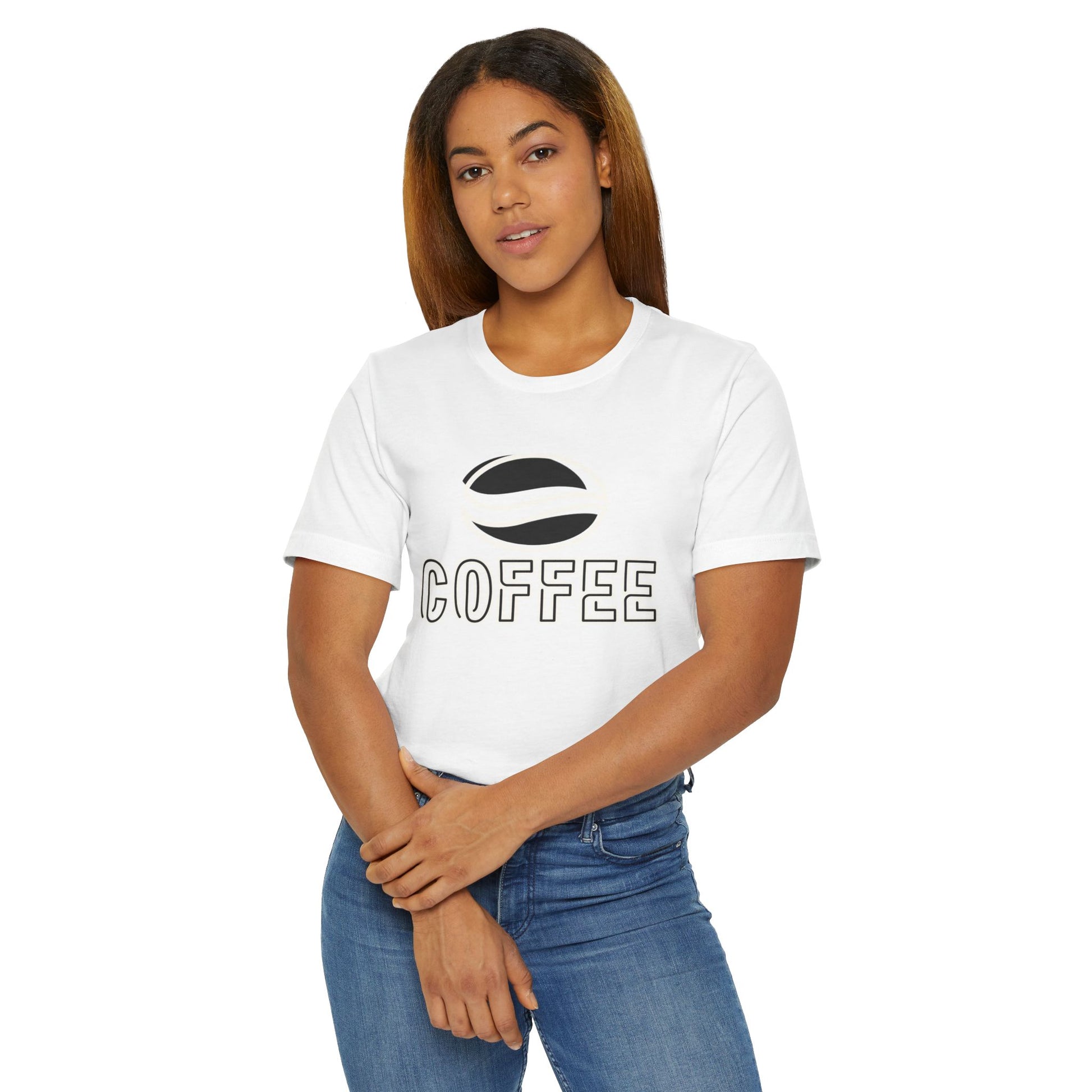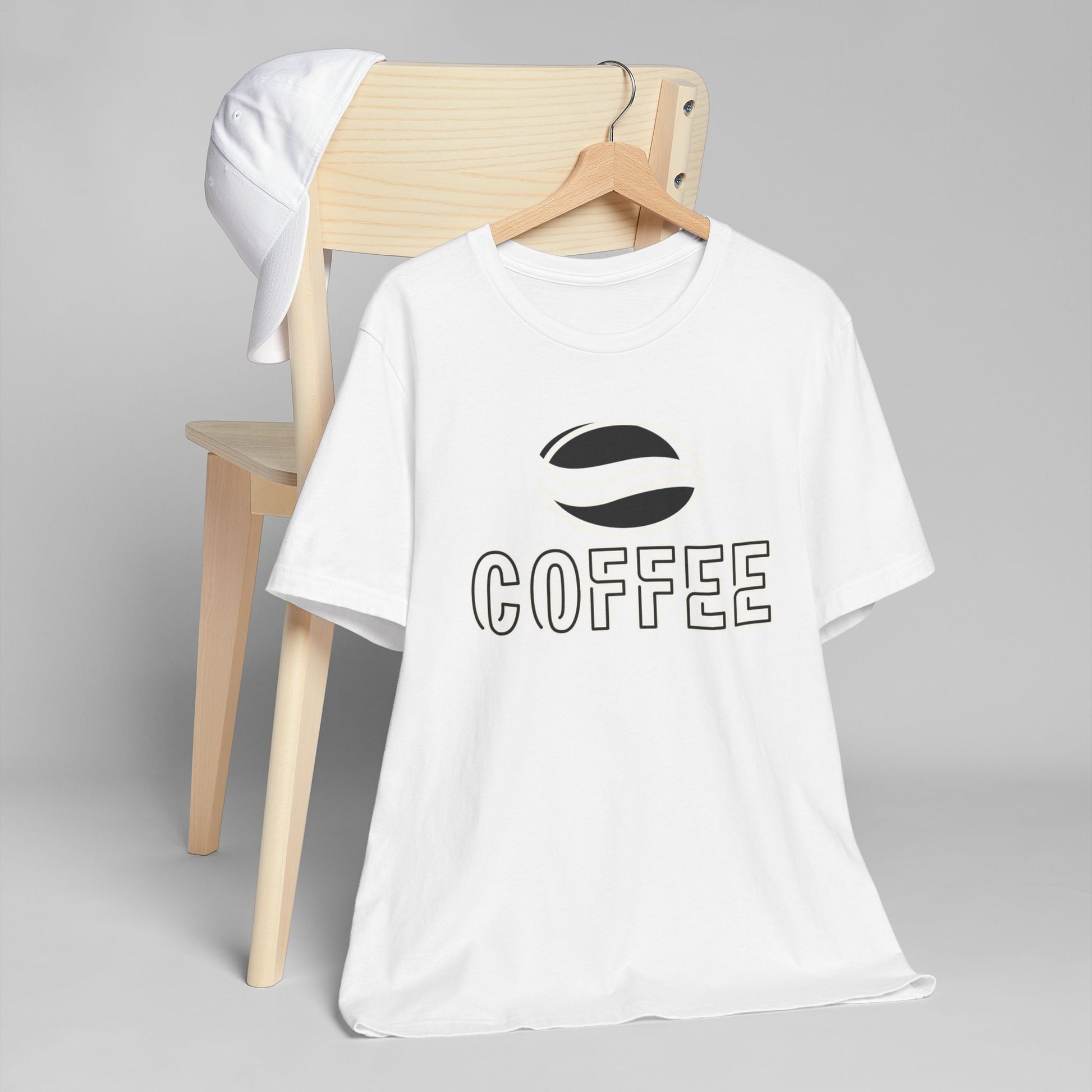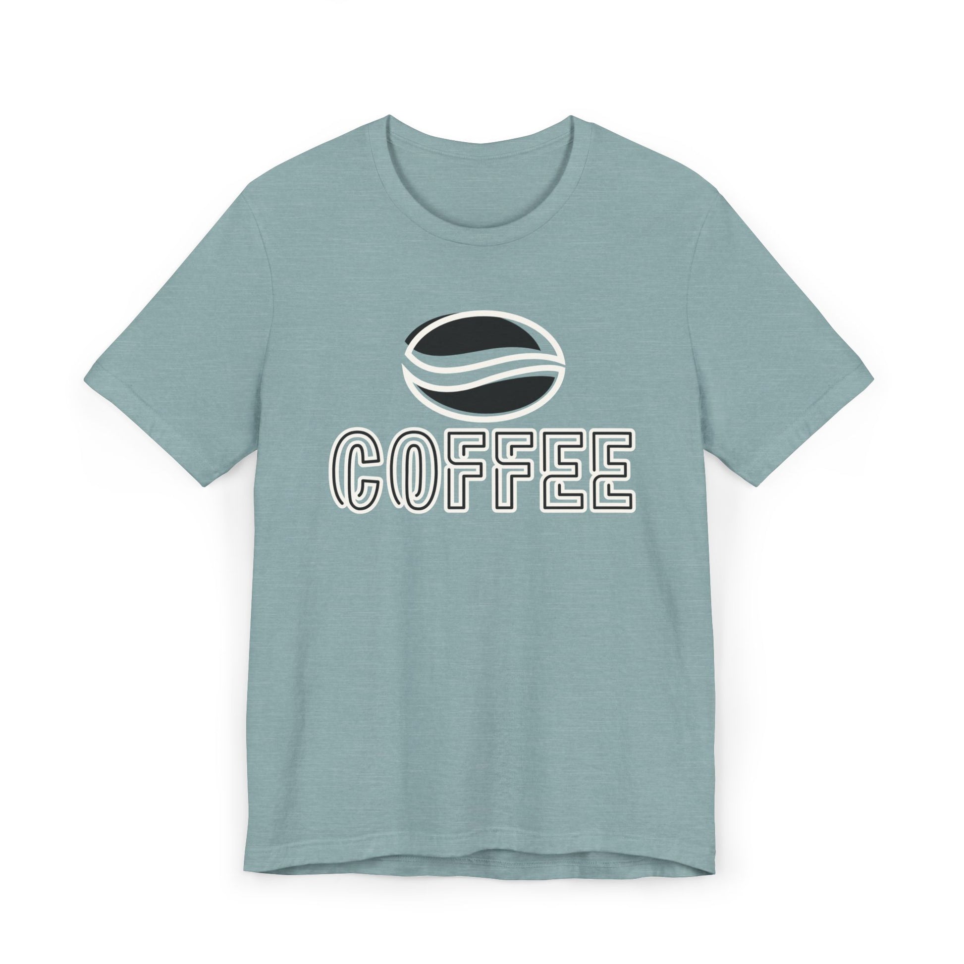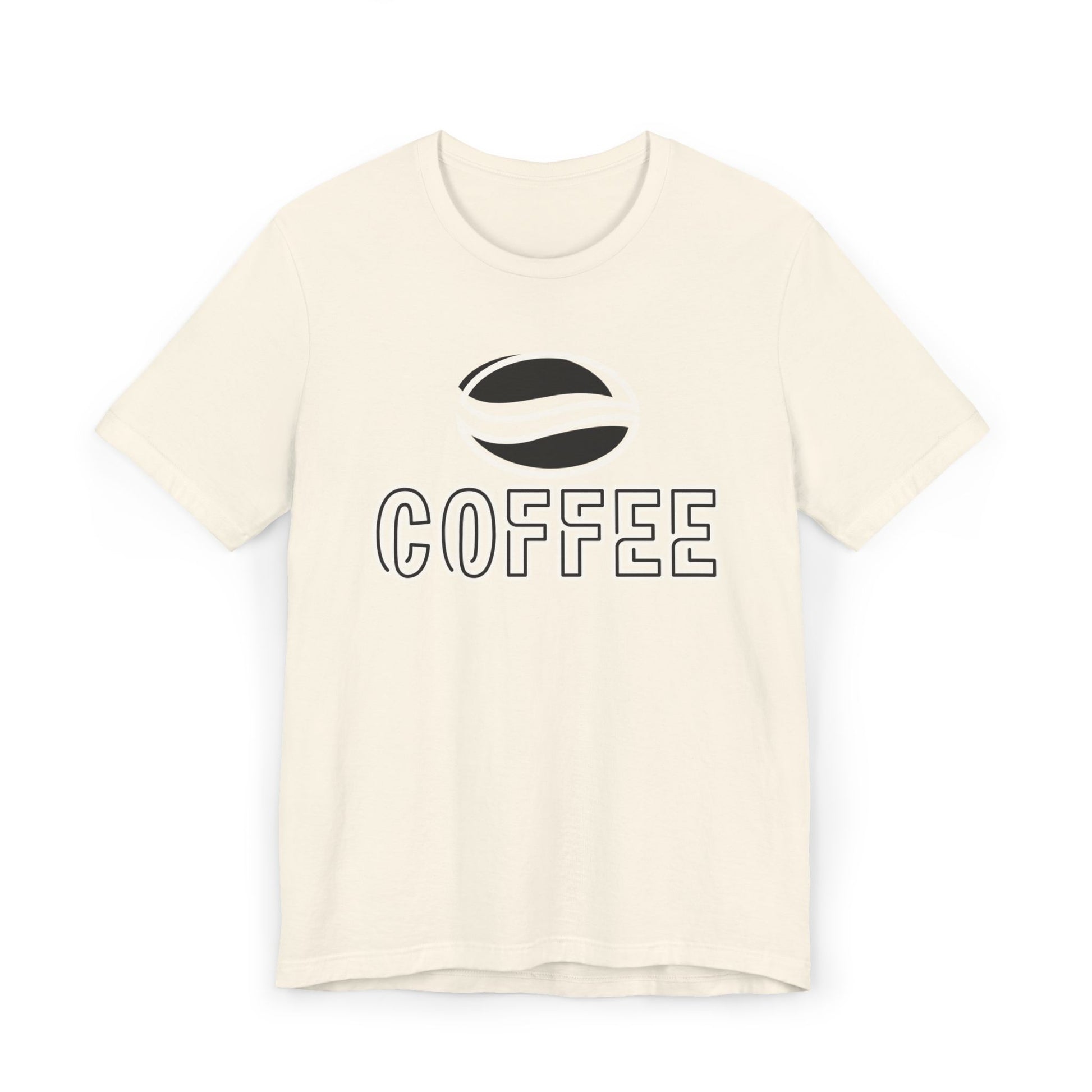 The design features a minimalist white coffee bean logo above bold outlined “COFFEE” text, giving it a modern and versatile look. With its classic crew neckline, ribbed knit collar that holds its shape, reinforced shoulders, and side seams for structure, this tee blends comfort with durability.