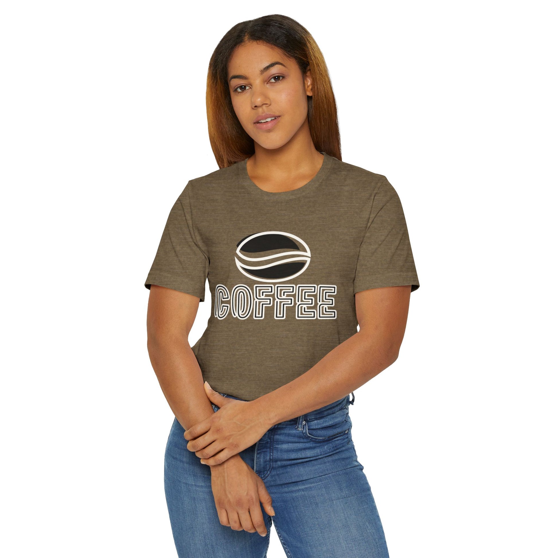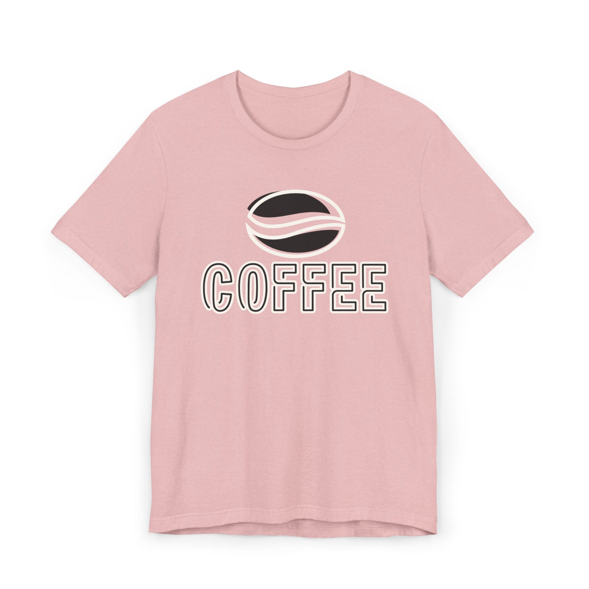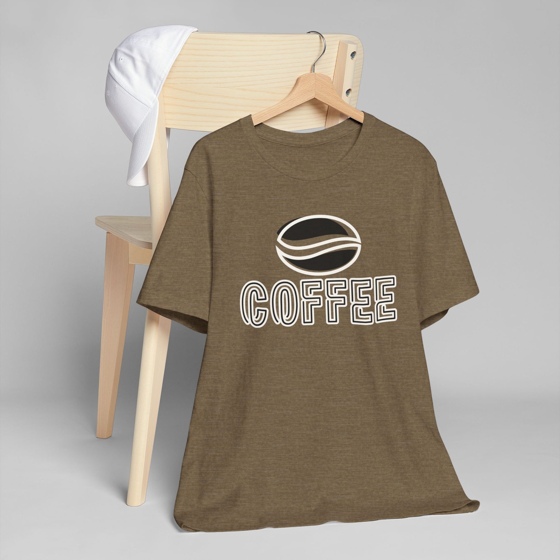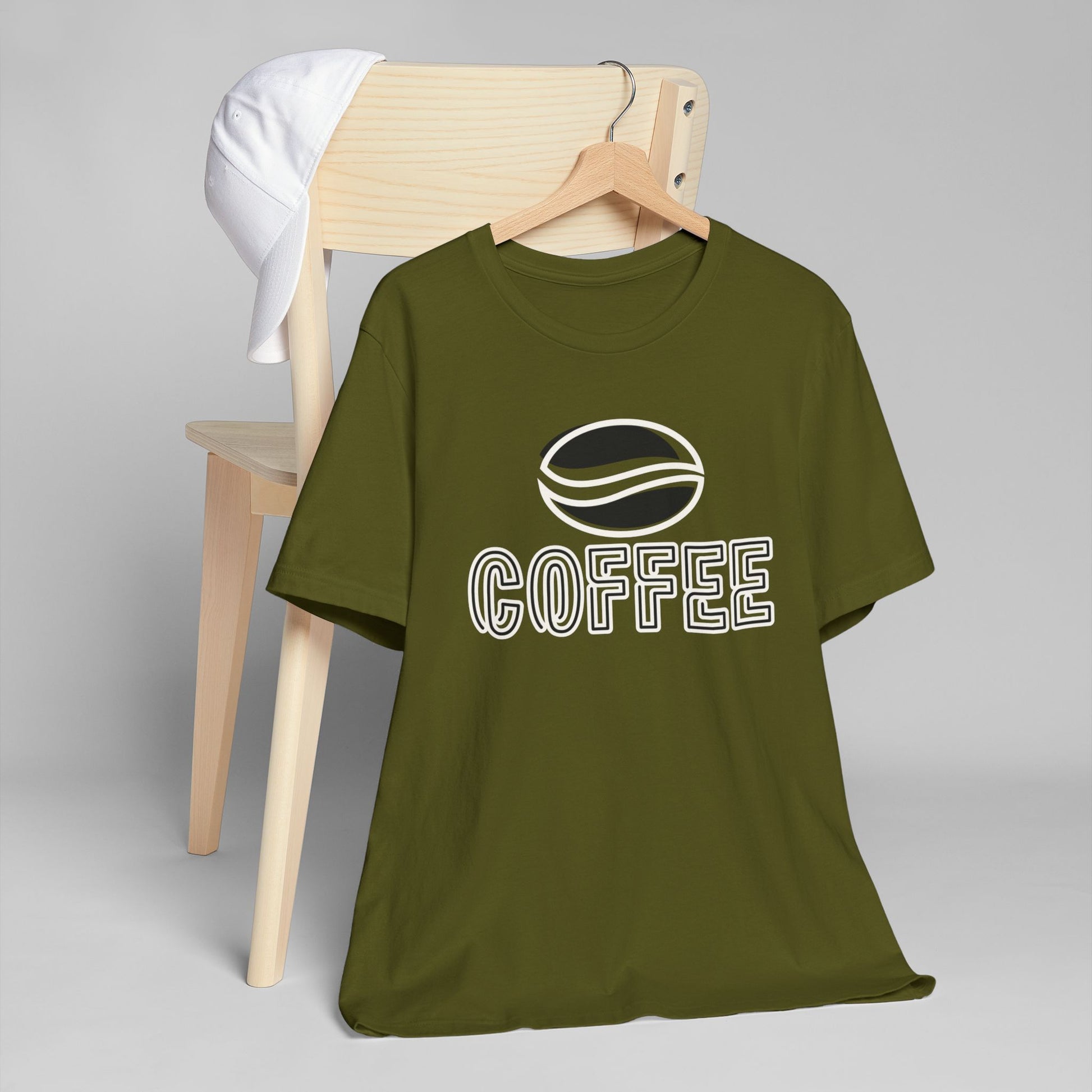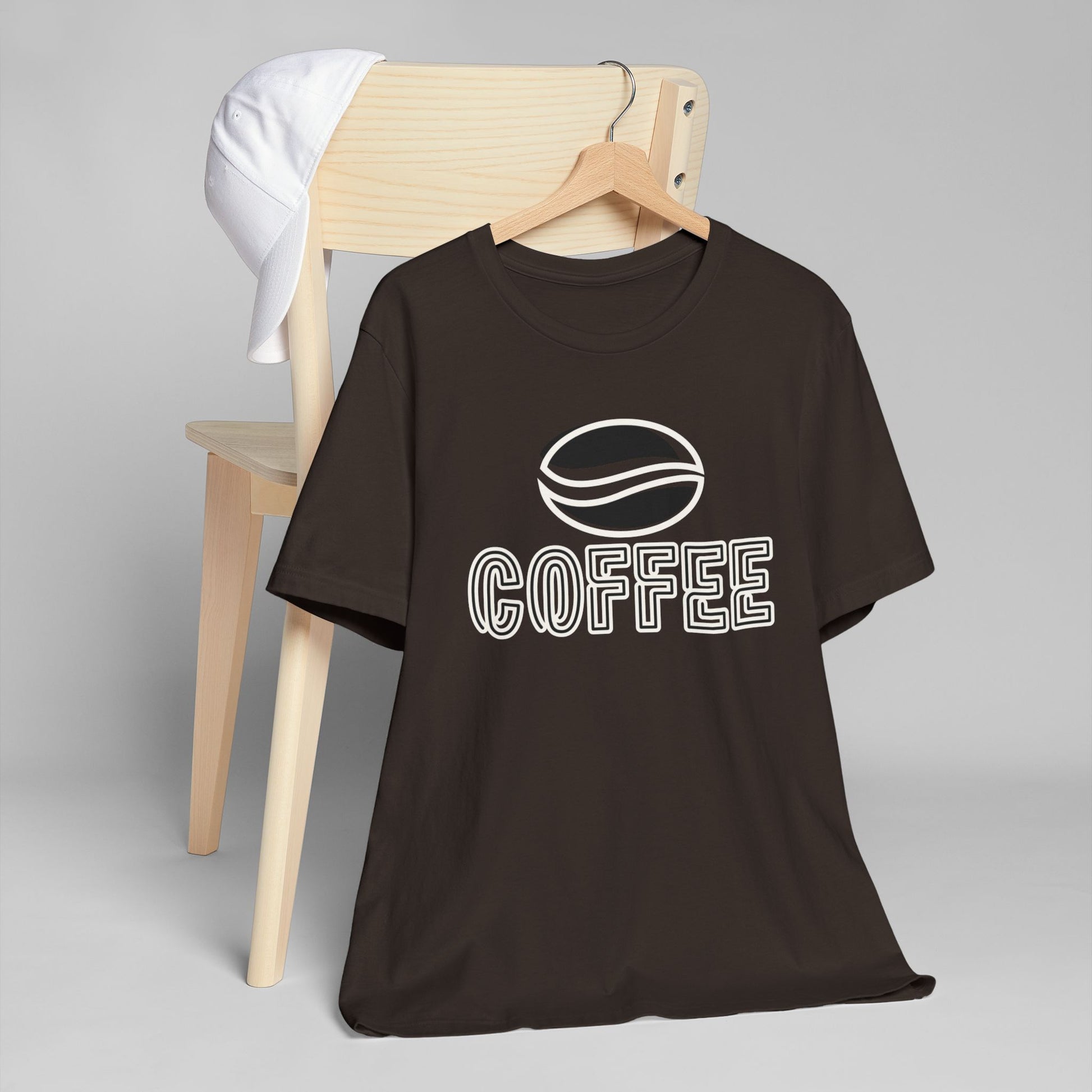 The design features a minimalist white coffee bean logo above bold outlined “COFFEE” text, giving it a modern and versatile look. With its classic crew neckline, ribbed knit collar that holds its shape, reinforced shoulders, and side seams for structure, this tee blends comfort with durability.