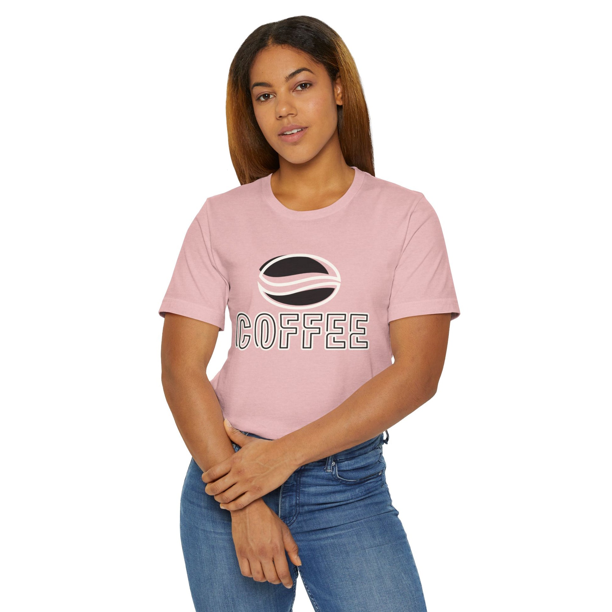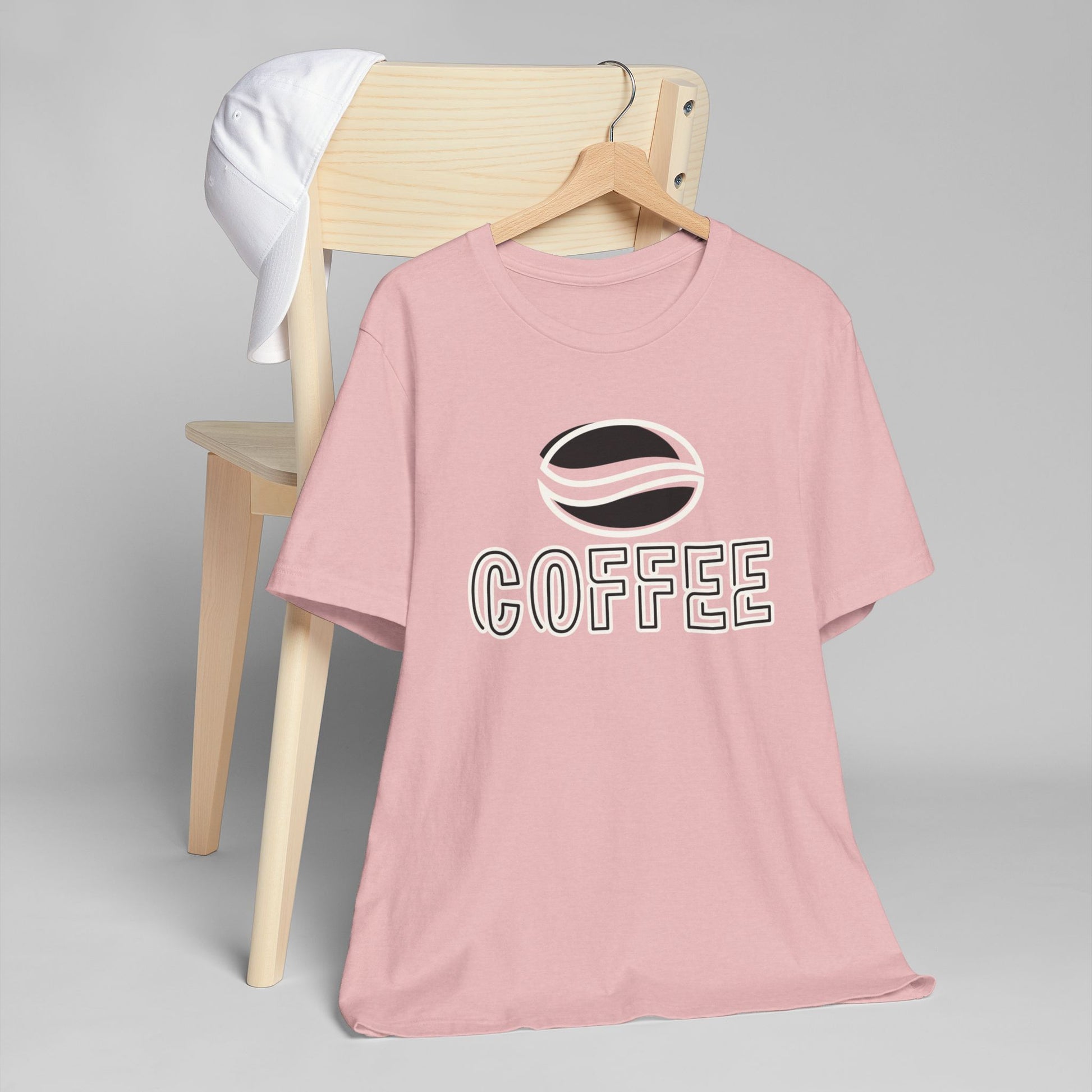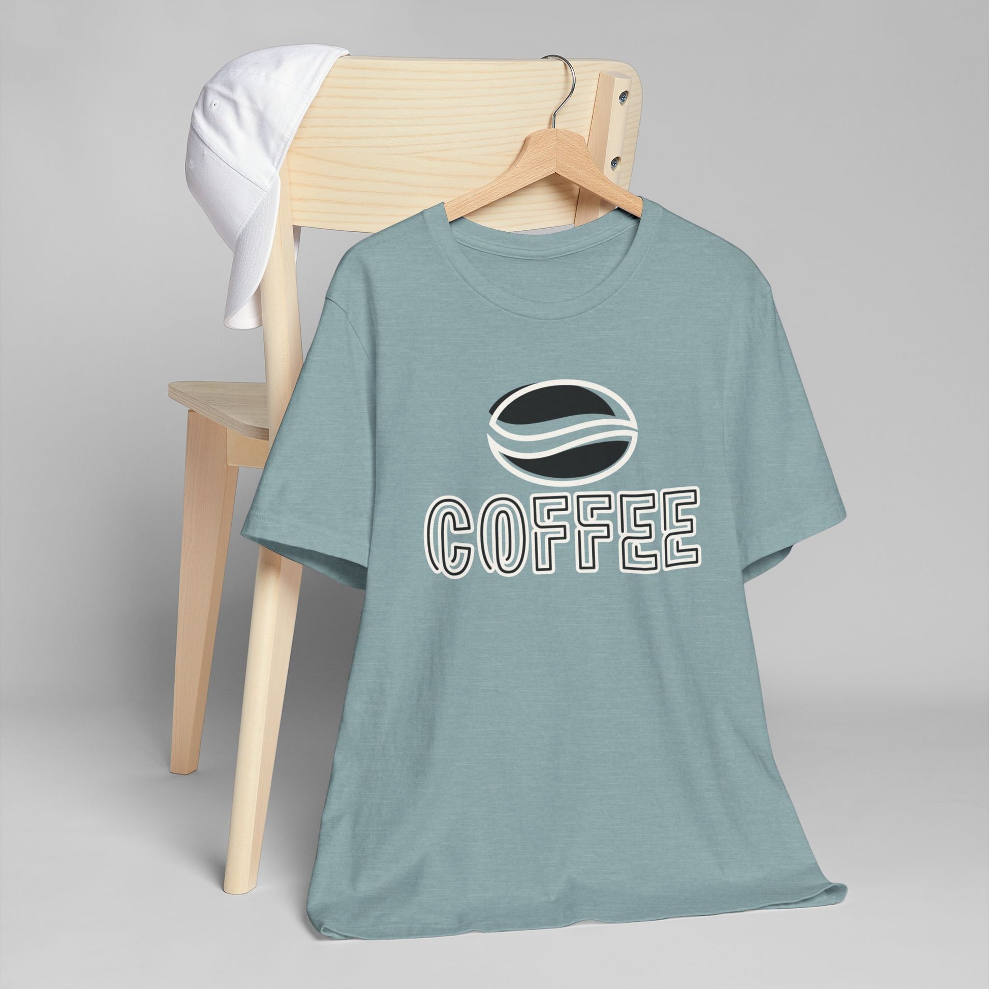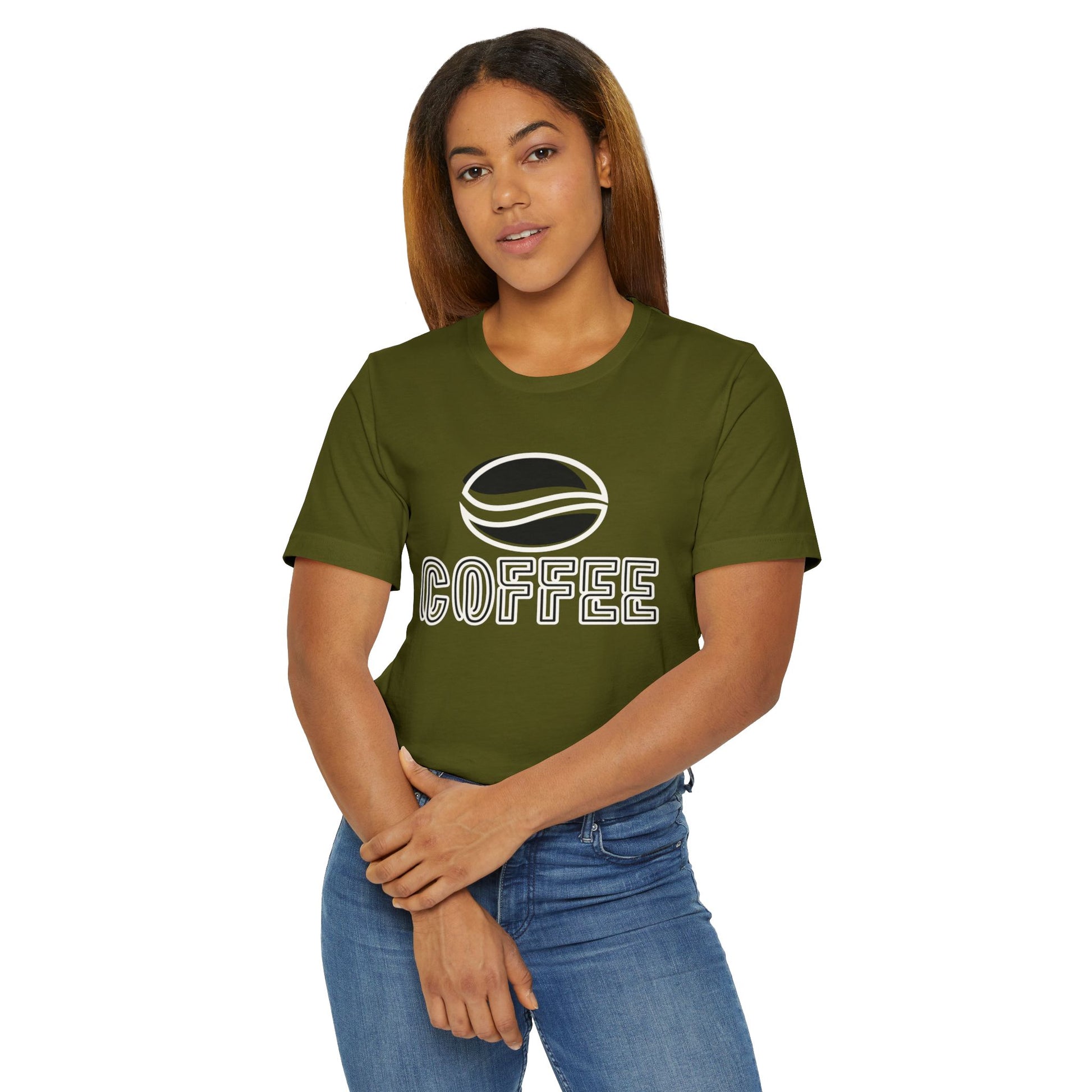 The design features a minimalist white coffee bean logo above bold outlined “COFFEE” text, giving it a modern and versatile look. With its classic crew neckline, ribbed knit collar that holds its shape, reinforced shoulders, and side seams for structure, this tee blends comfort with durability.