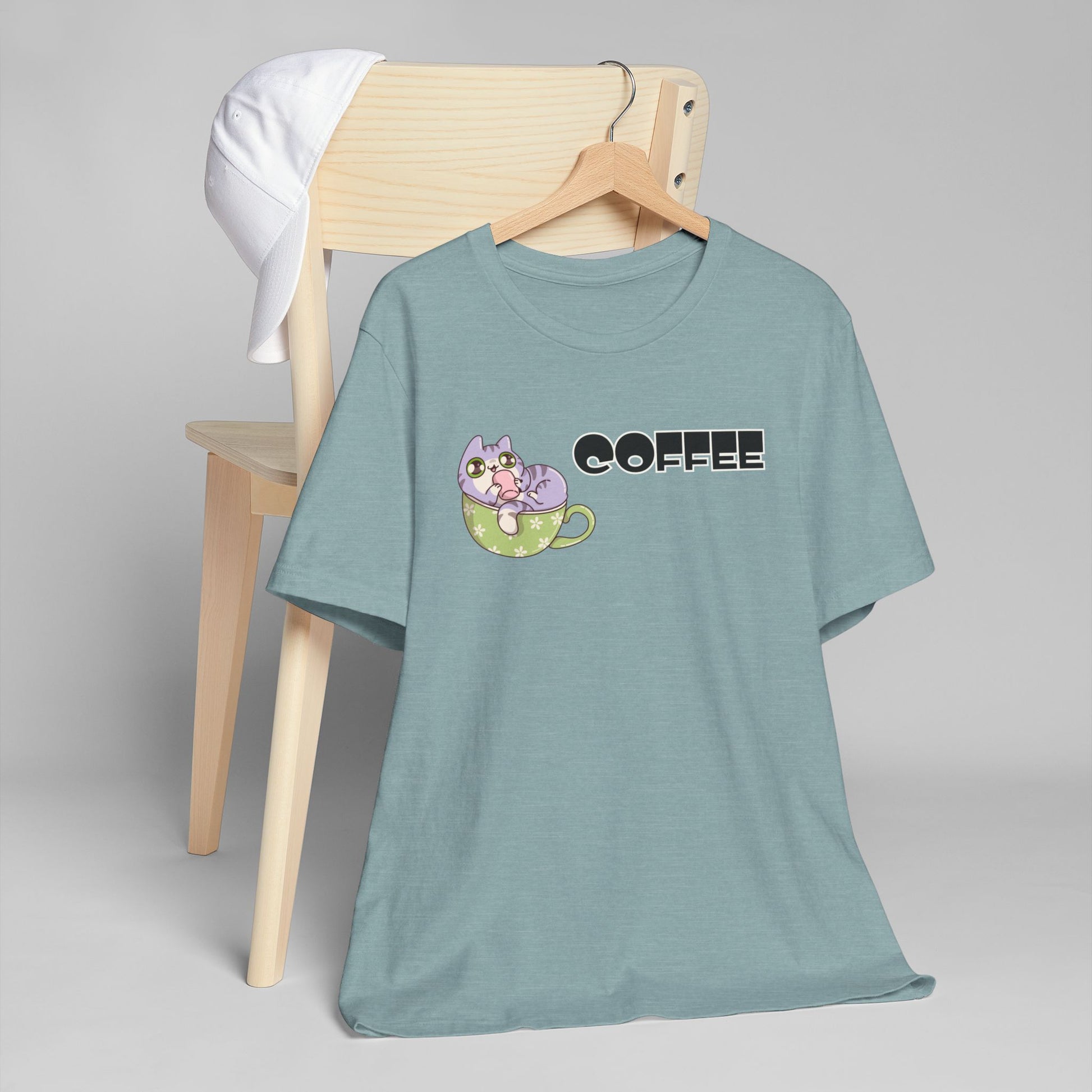 The design features a cute cat enjoying coffee alongside bold “COFFEE” lettering, making it a fun and eye-catching statement piece for coffee lovers. With its retail fit and classic crew neckline, it delivers all-day comfort while keeping your look effortlessly stylish.