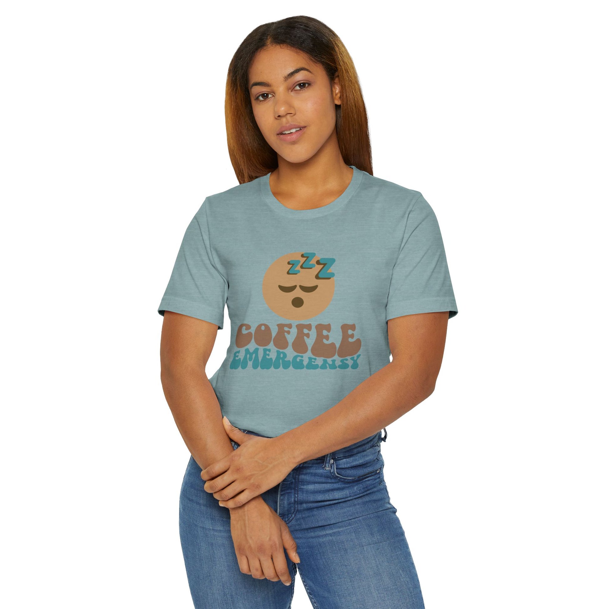 The playful design features a sleepy emoji with βCoffee Emergencyβ lettering in bold retro style, making it a fun and eye-catching statement piece for coffee lovers who canβt start the day without their brew. With its retail fit and classic crew neckline, it delivers all-day comfort while keeping your look effortlessly stylish.