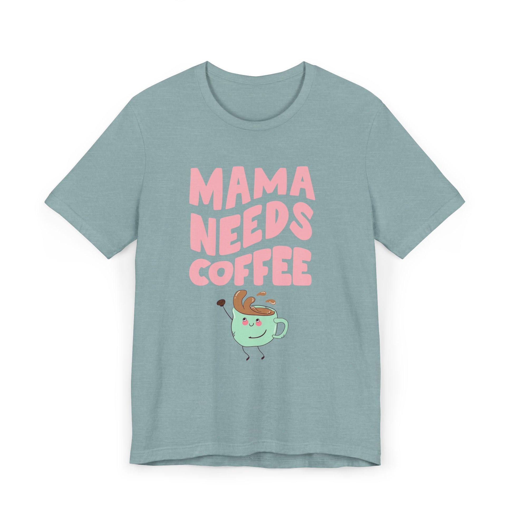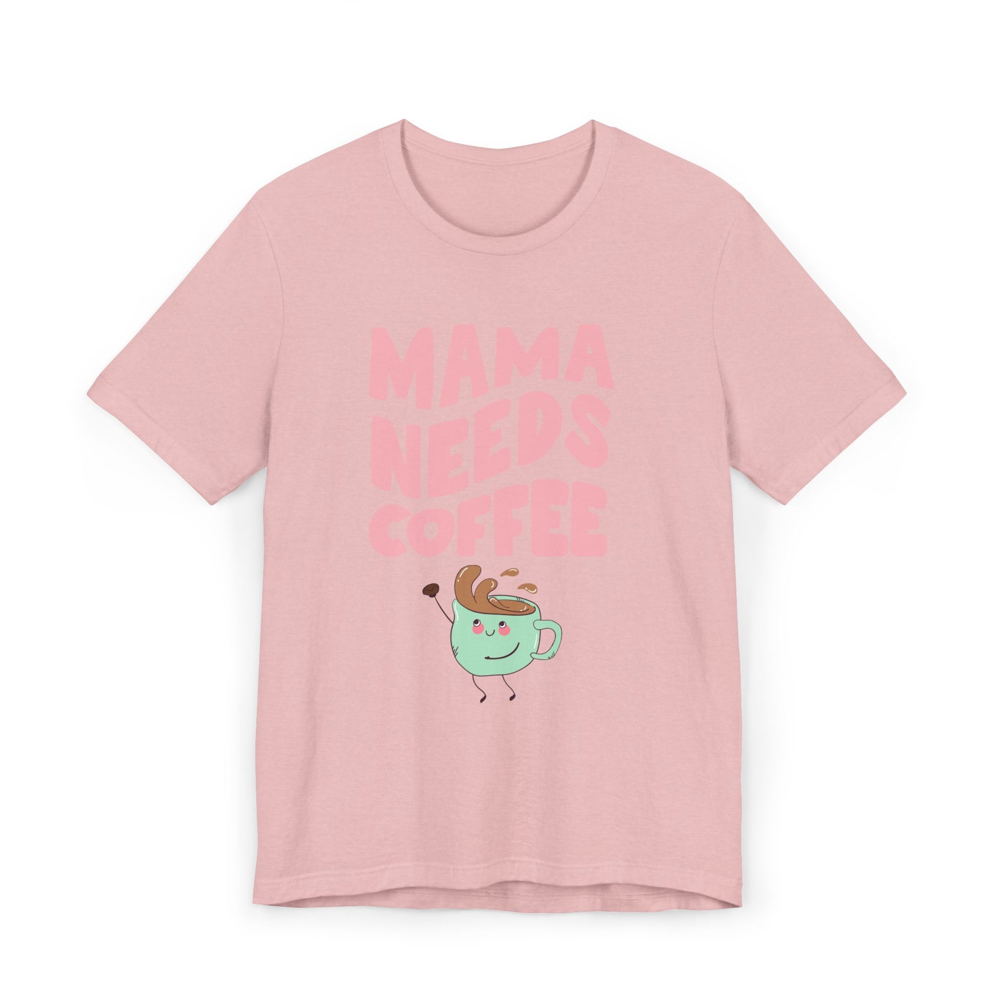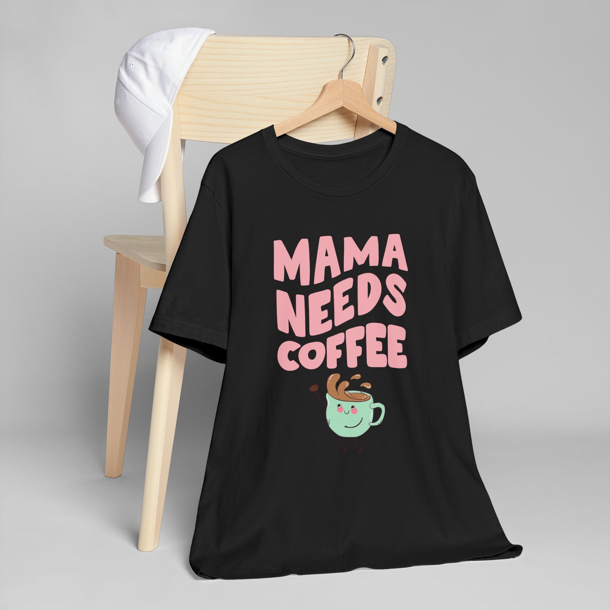 A: The Mama Needs Coffee T-Shirt is a soft cotton tee with a cute coffee cup design, shipped fast across the USA.