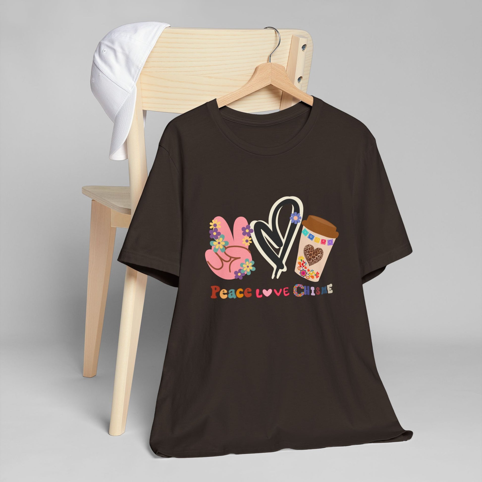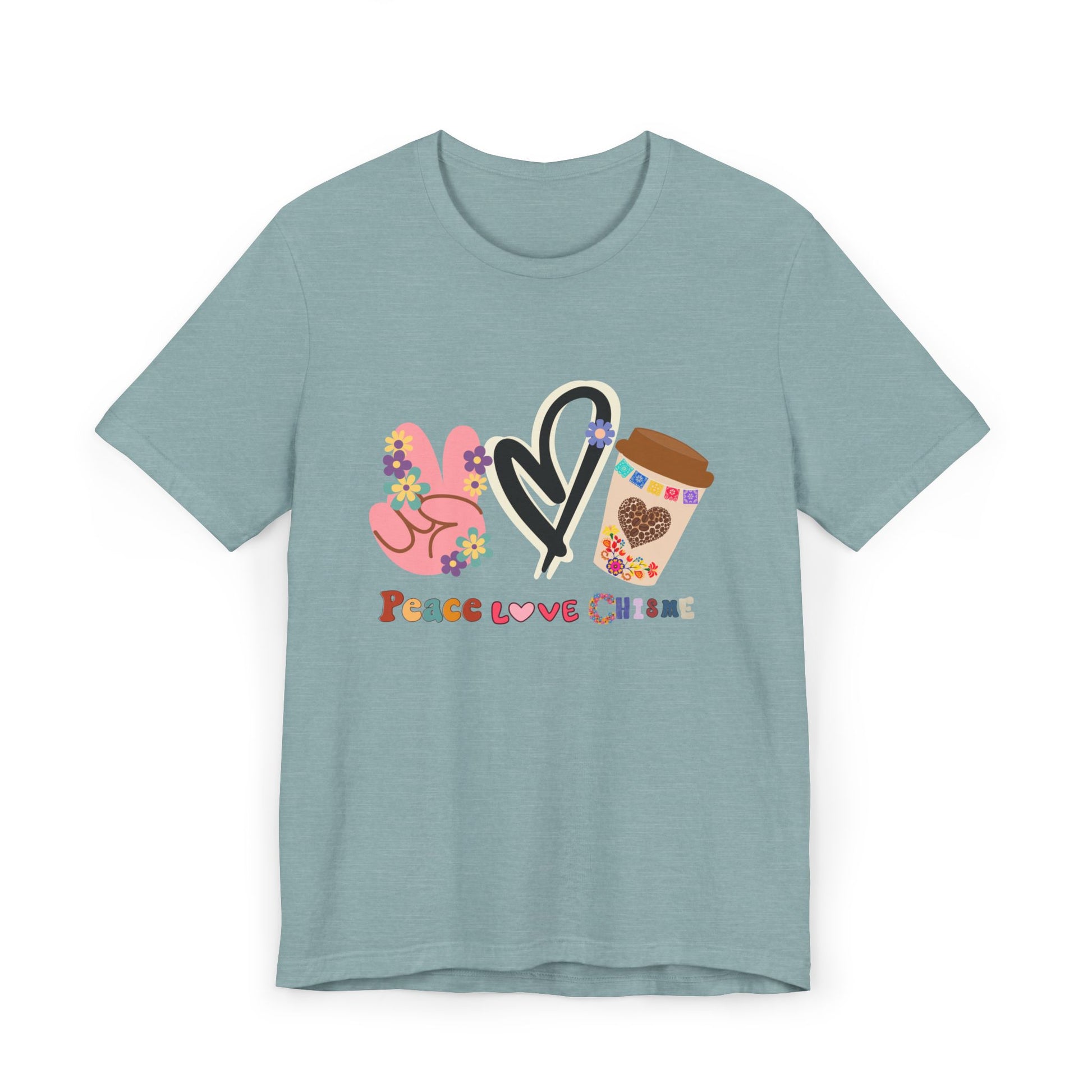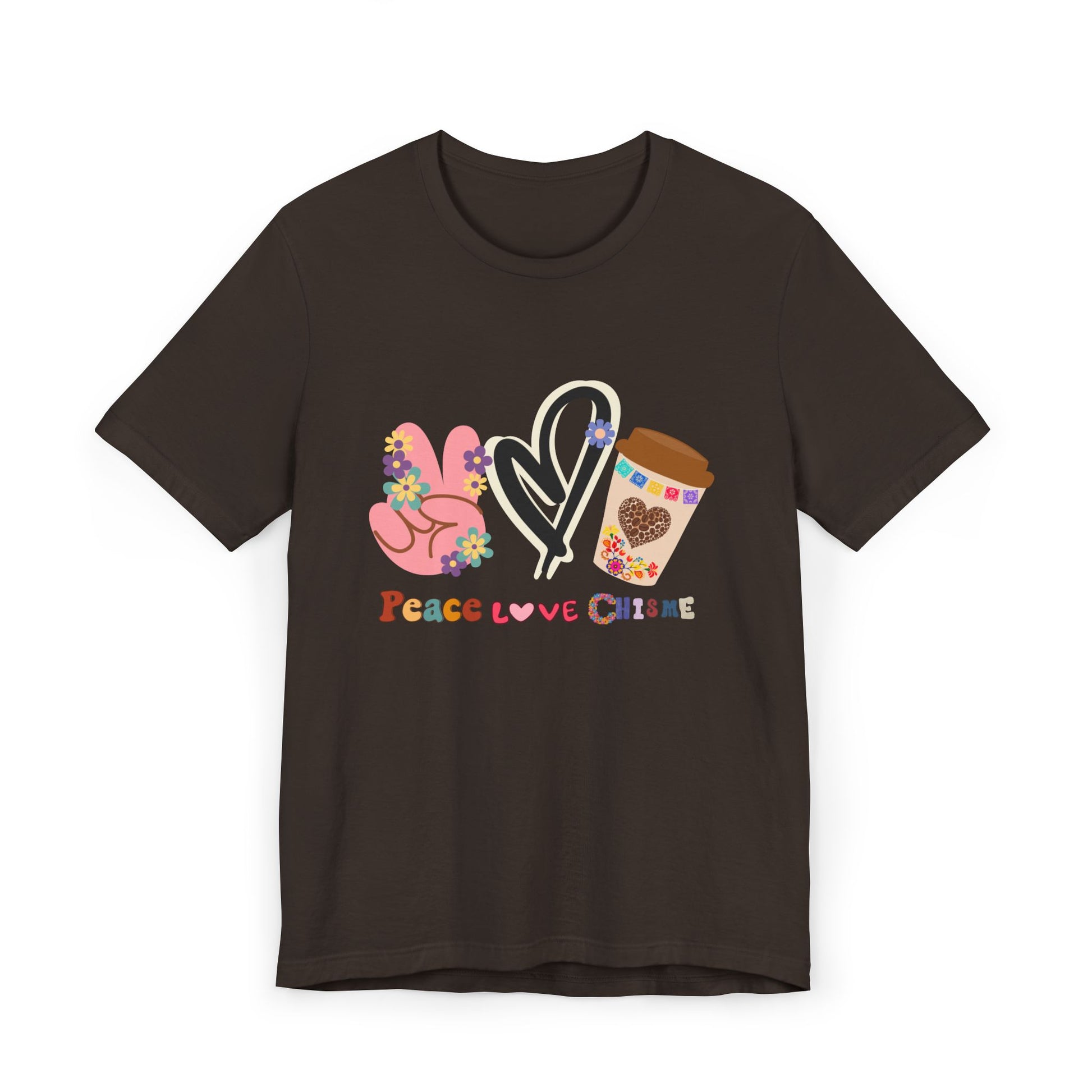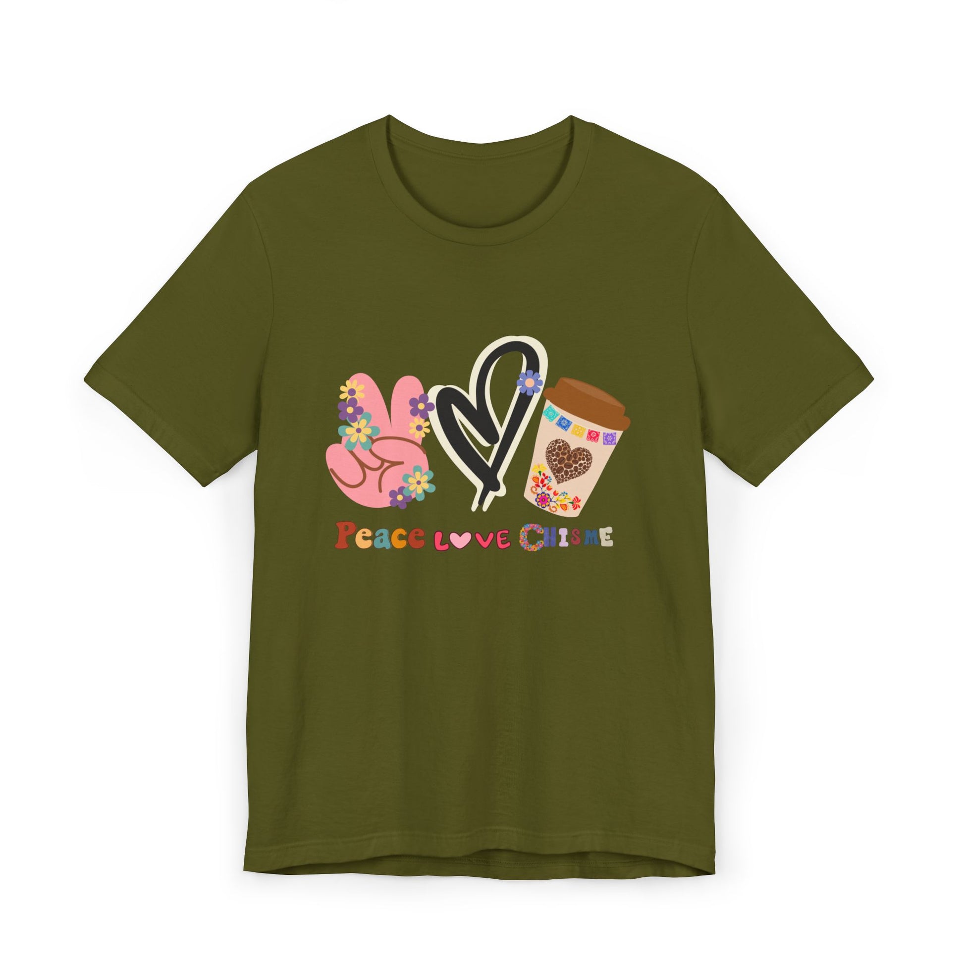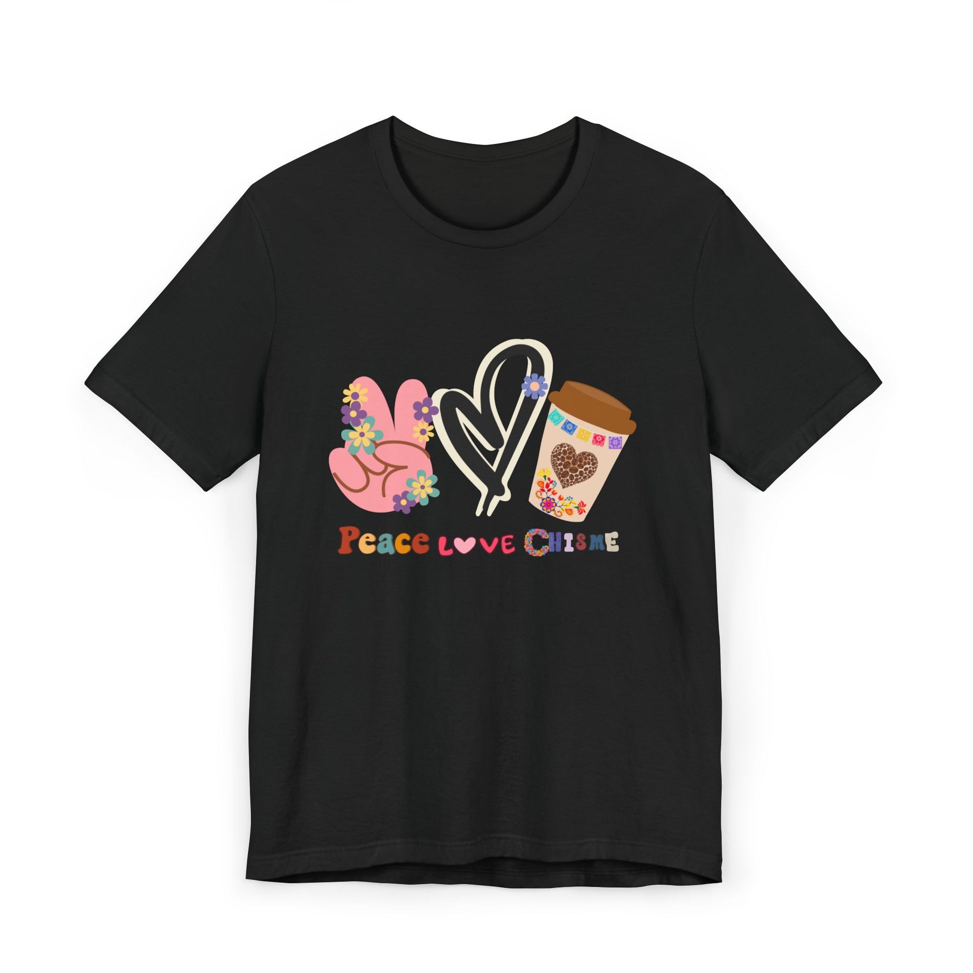 Peace Love Chisme T-Shirt – Fun Coffee Graphic Tee for Everyday Vibes (USA Shipping)