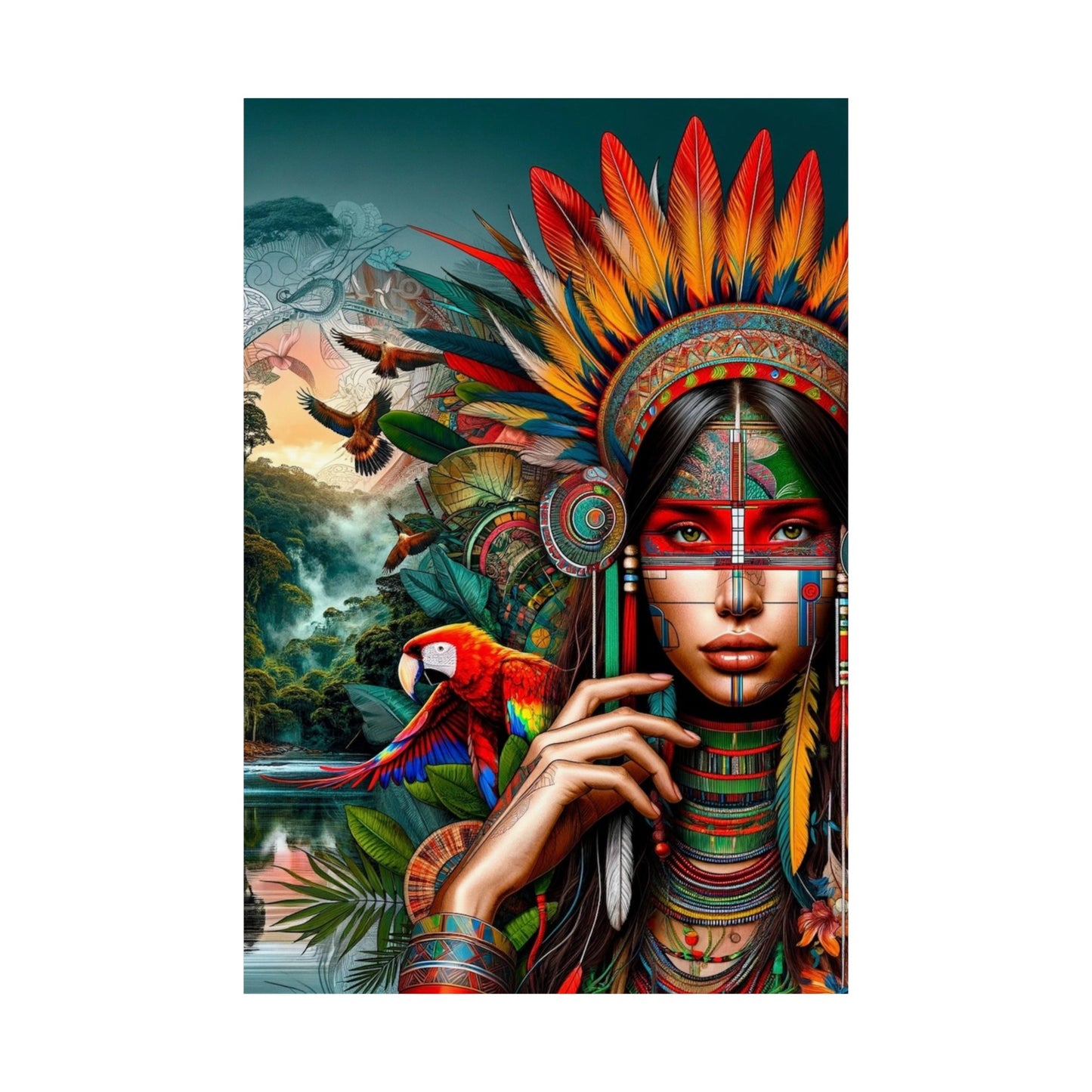 Explore a bold and unique artistic poster of an Ashaninka girl, blending traditional tribal clothing with modern, avant-garde art styles. This striking design uses advanced graphic techniques to showcase elements of the Amazon rainforest, creating a powerful visual experience, decorate your home or workplace.