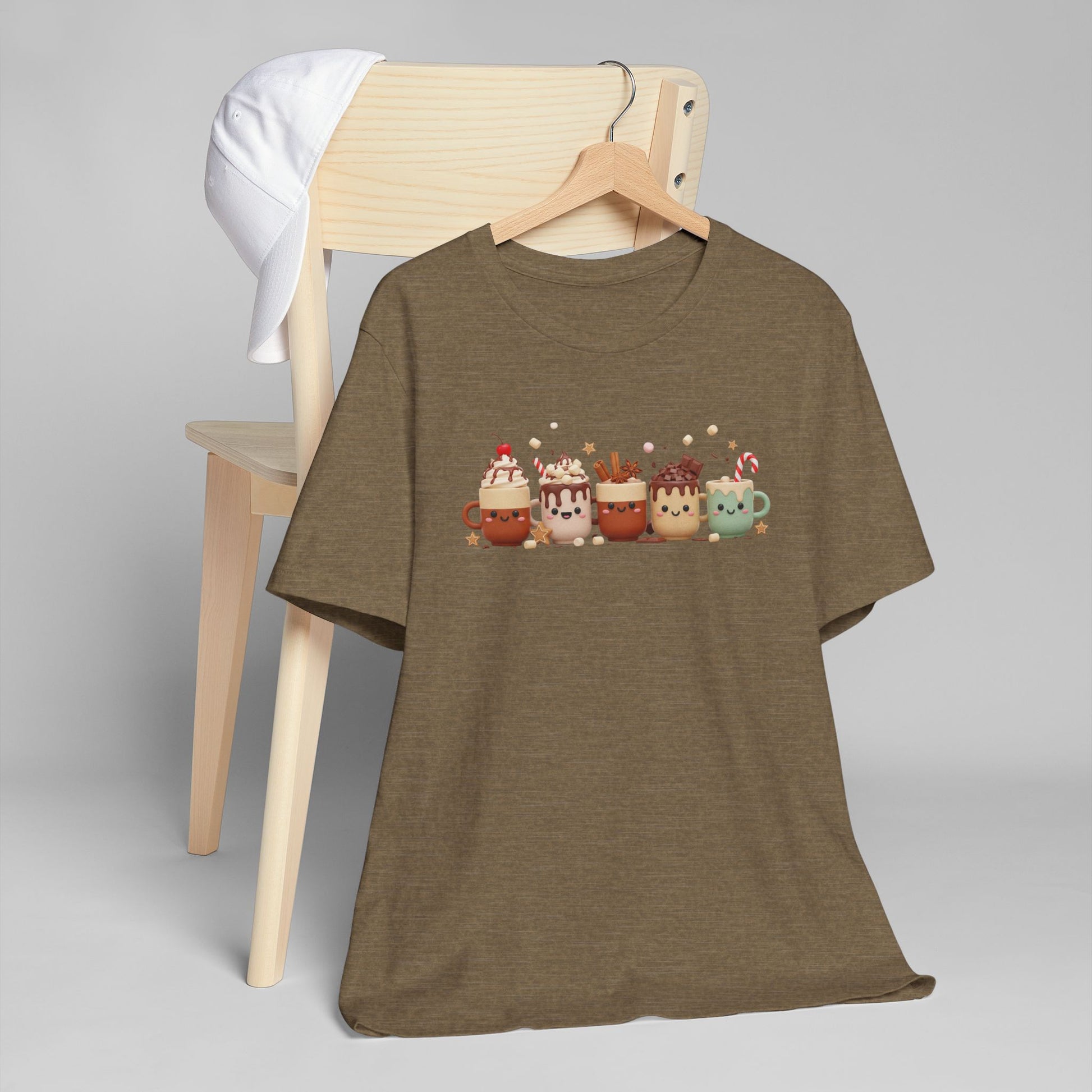This Cute Holiday Cocoa Mugs Tee features an adorable lineup of festive mugs filled with whipped cream, marshmallows, candy canes, and hot cocoa. Itβs perfect for holiday gatherings, cozy cafΓ© trips, or gifting to friends who love sweet seasonal drinks.