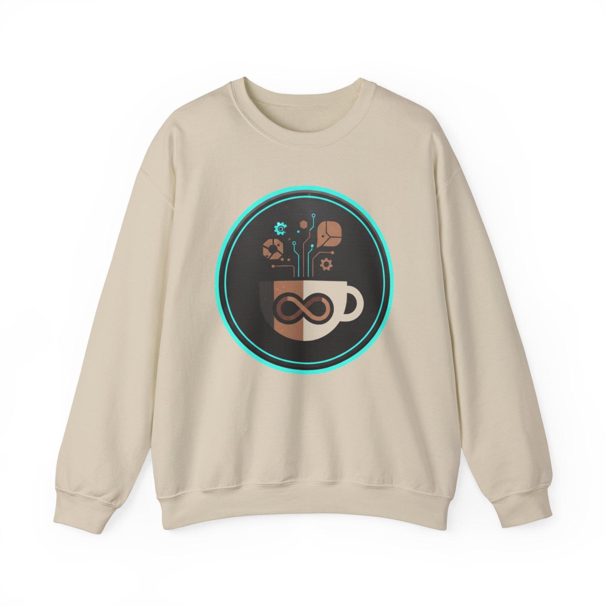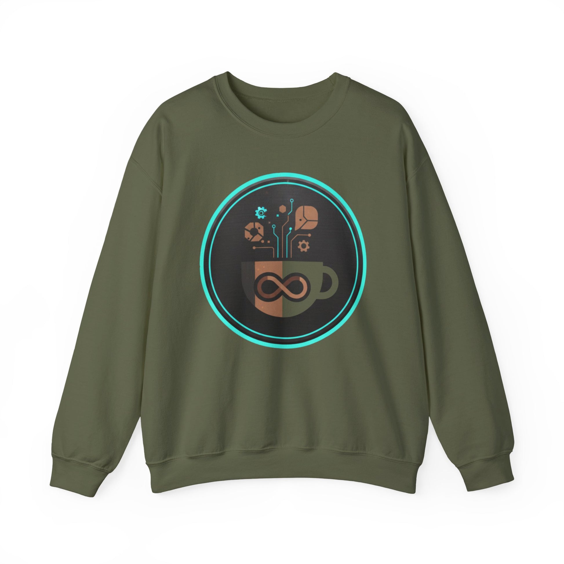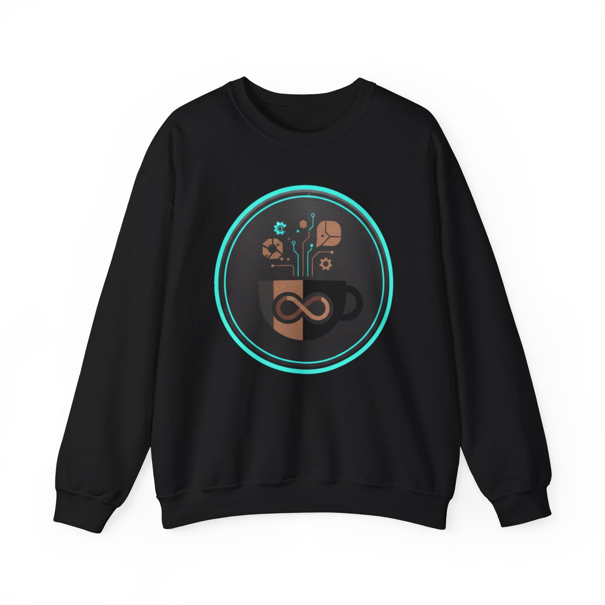 The Eco-Tech Coffee Infinity Sweatshirt blends sustainability with modern design. Featuring a bold infinity symbol inside a coffee cup, accented with digital tech lines, gears, and eco-leaf icons, this unisex crewneck is a symbol of endless energy and innovation.