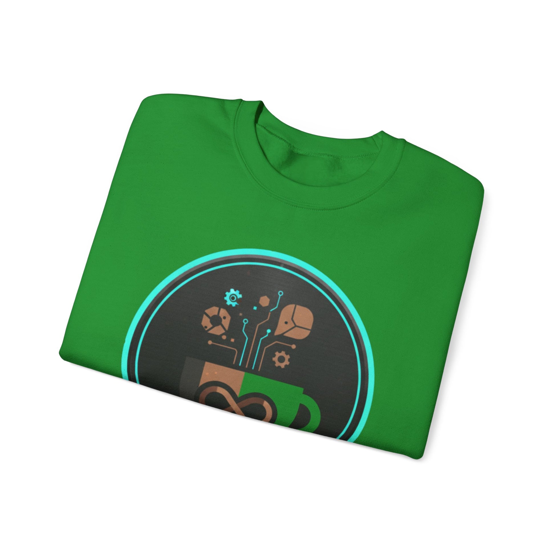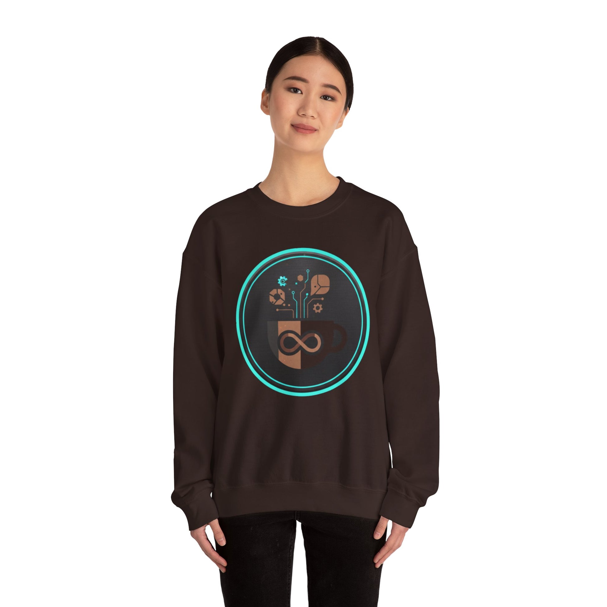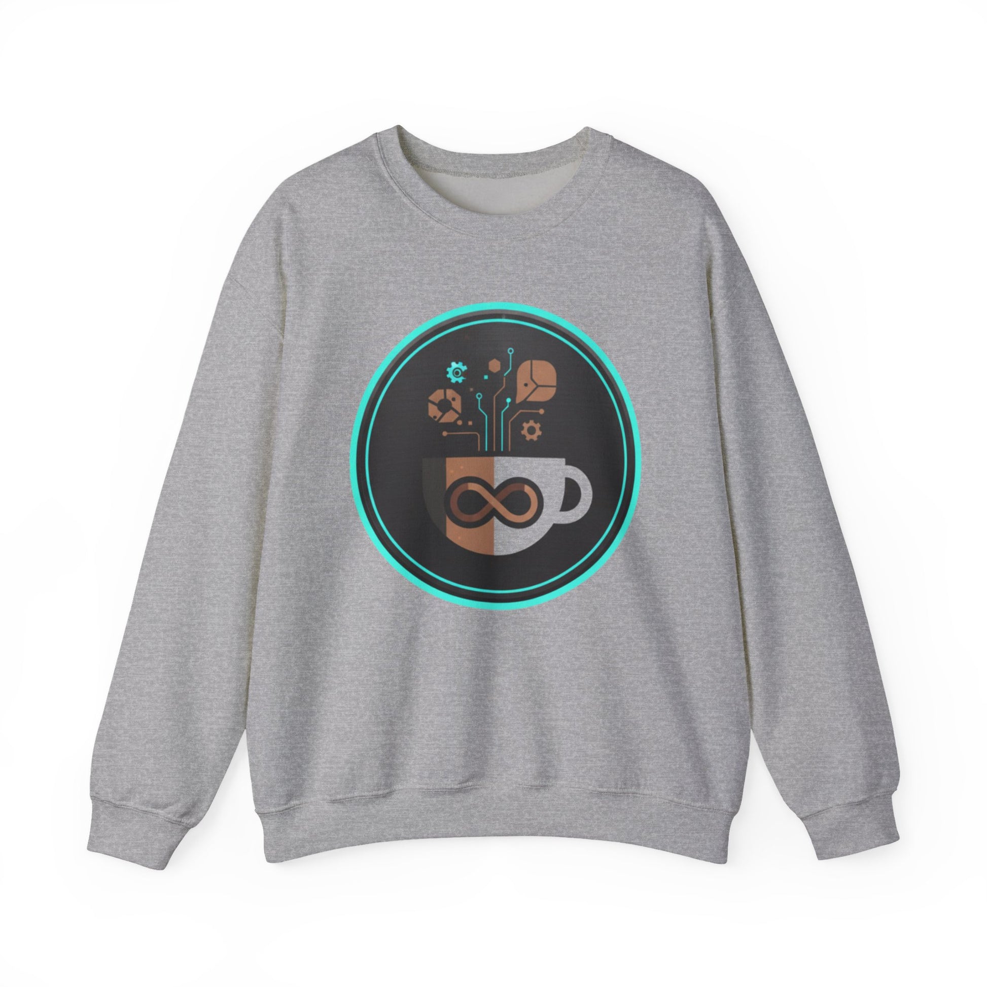 The Eco-Tech Coffee Infinity Sweatshirt blends sustainability with modern design. Featuring a bold infinity symbol inside a coffee cup, accented with digital tech lines, gears, and eco-leaf icons, this unisex crewneck is a symbol of endless energy and innovation.