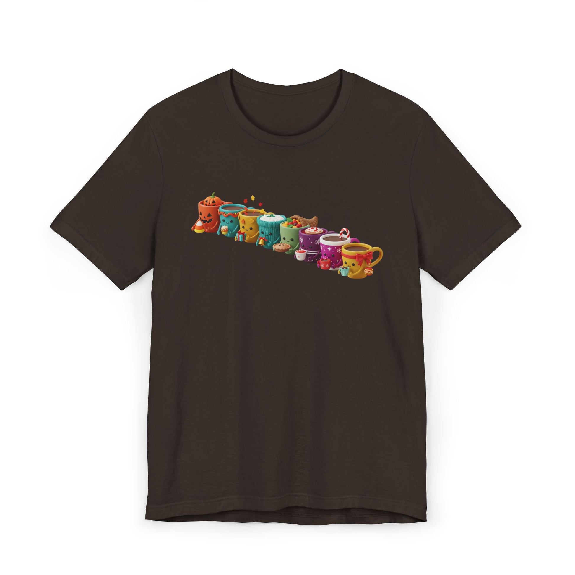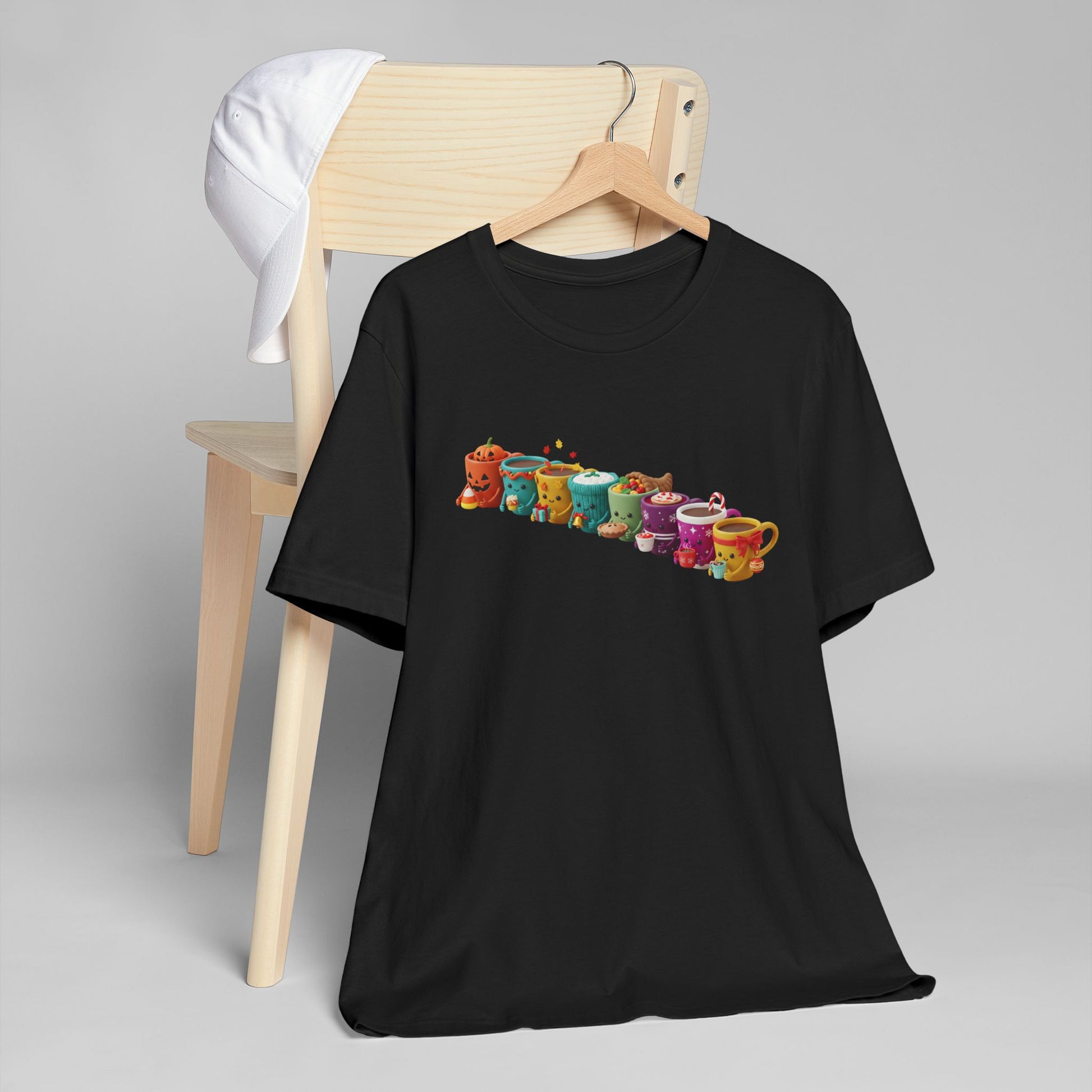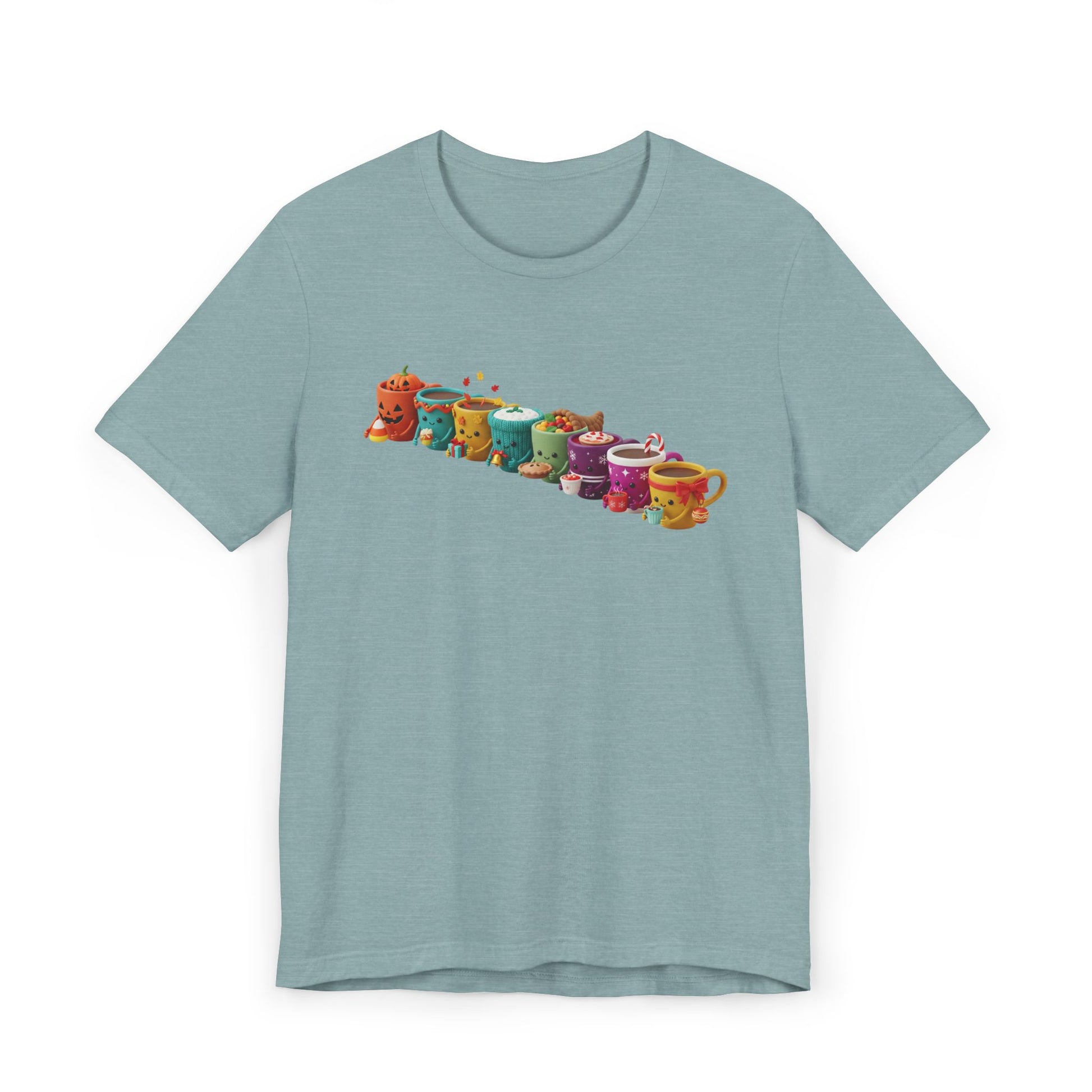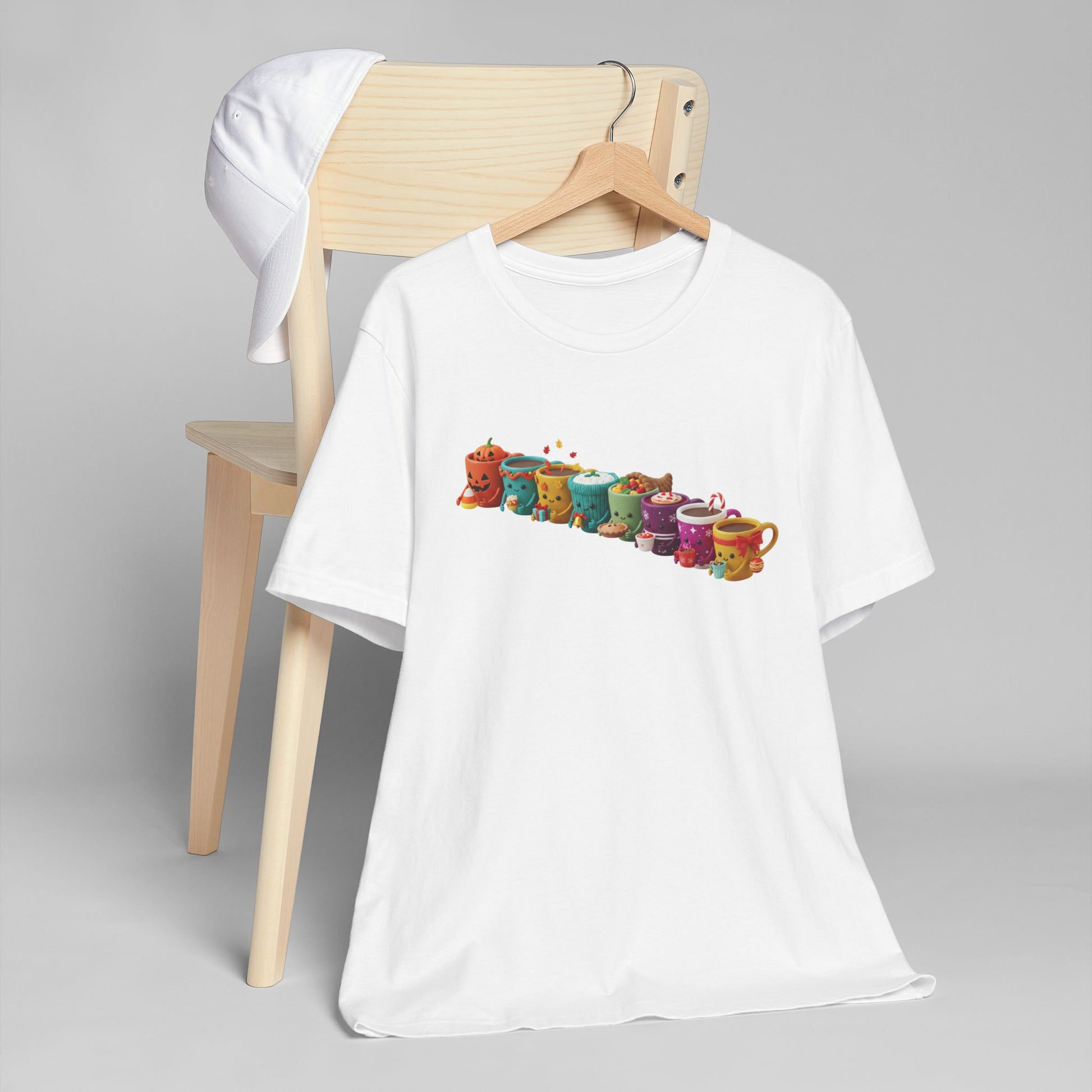 This Festive Coffee Cups Parade Tee features a lineup of cheerful coffee mugs, each decorated for a different holiday celebration. From pumpkin spice in fall to peppermint mochas at Christmas, this shirt captures the joy of coffee all season long.