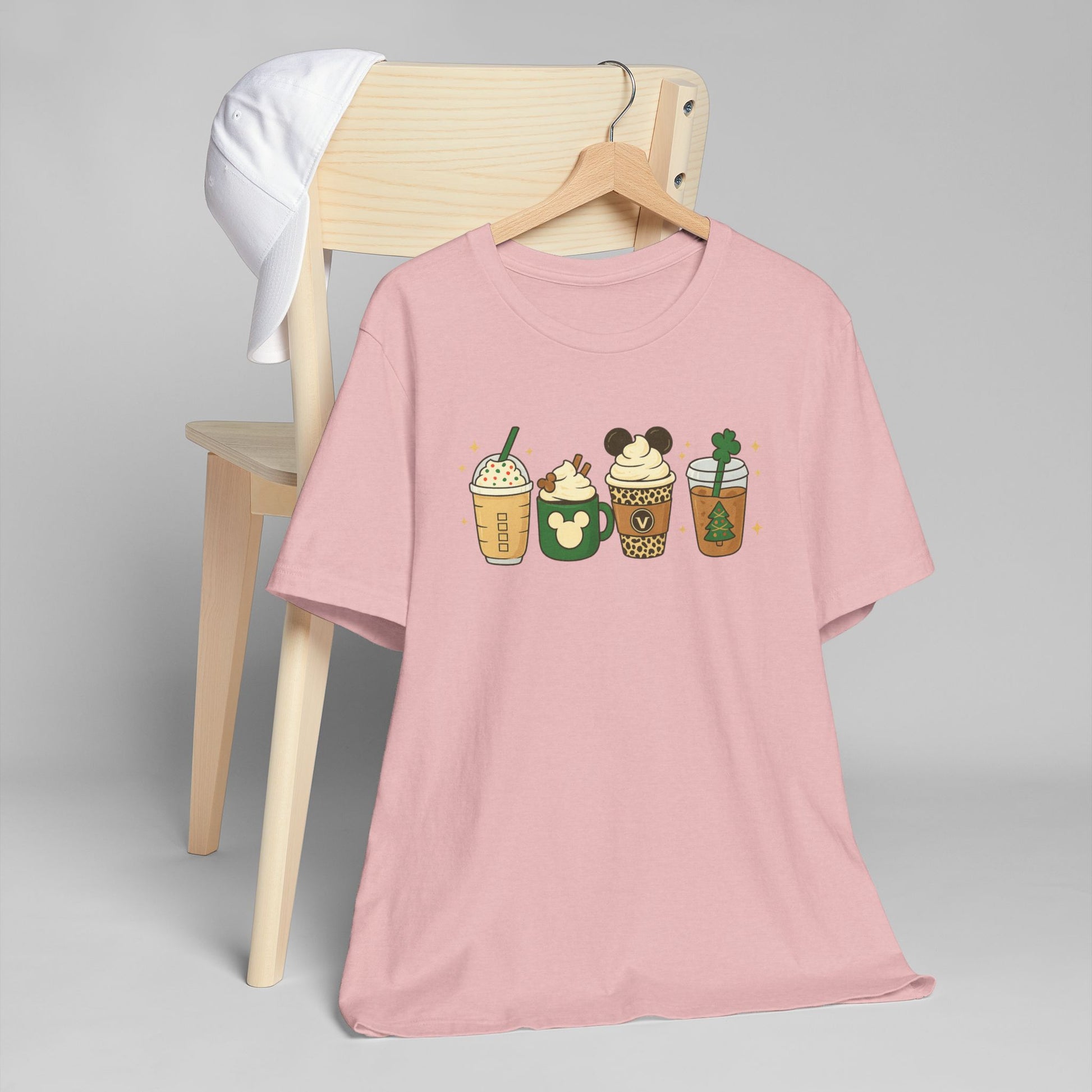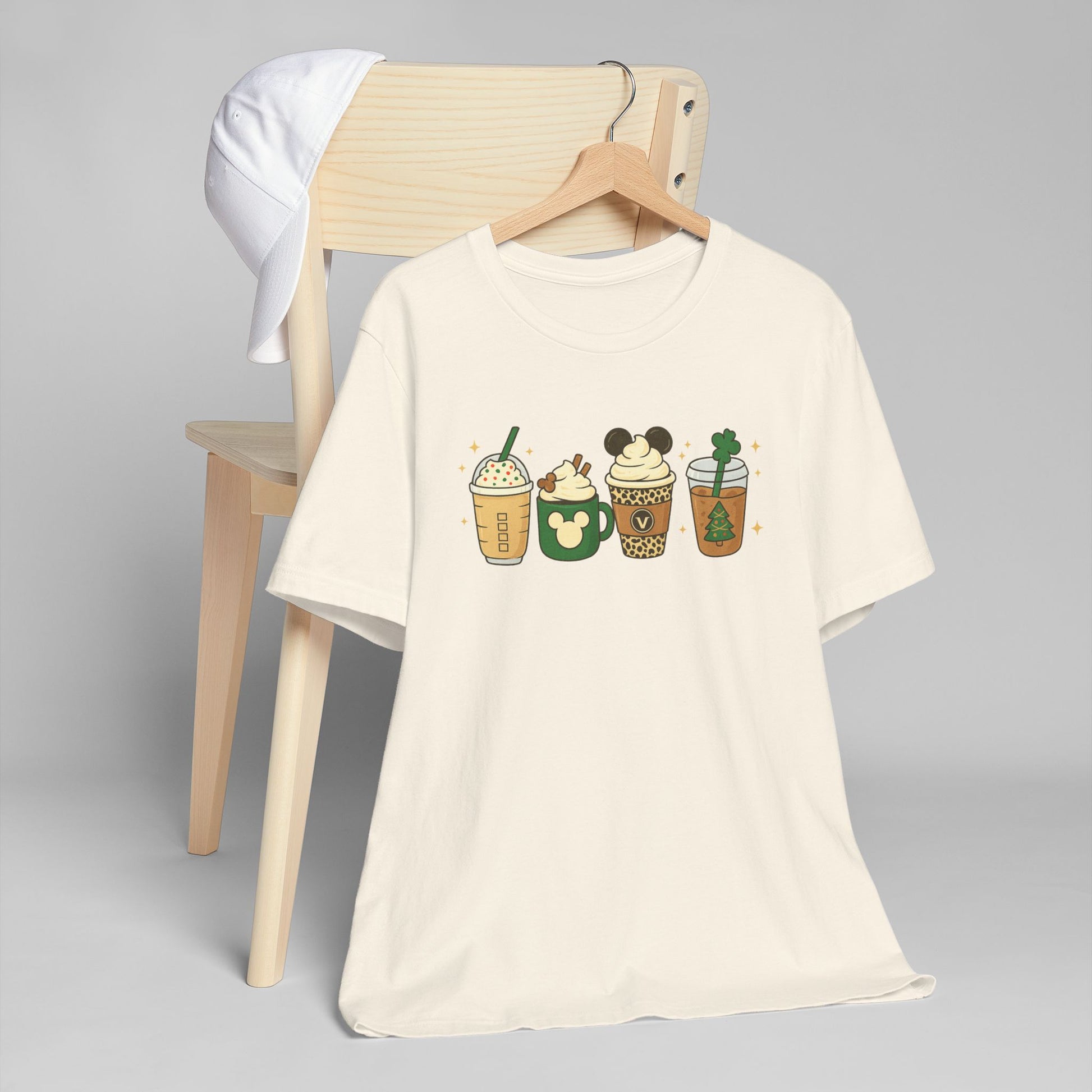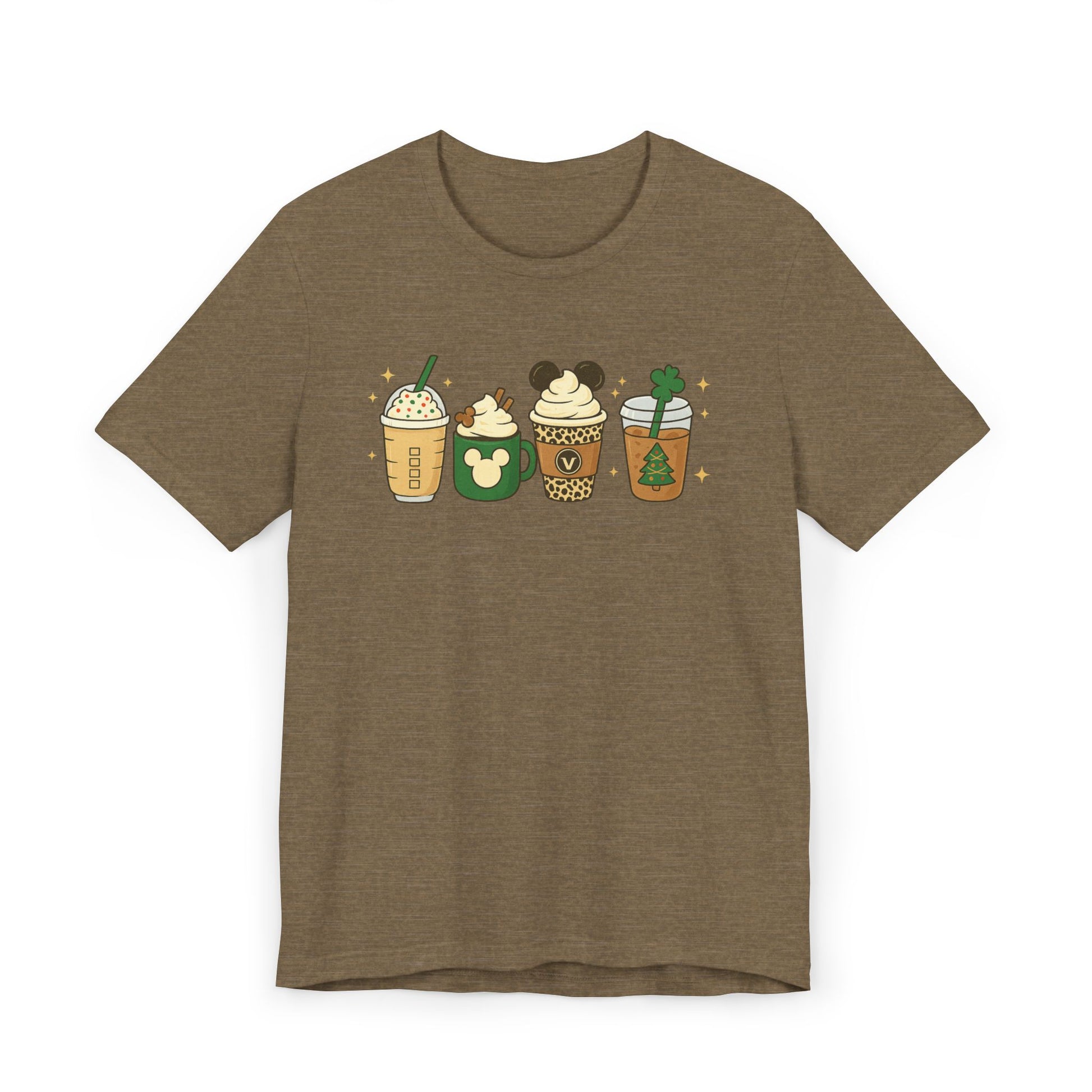 This Holiday Coffee Cups Tee celebrates the season with a playful lineup of festive coffee drinks. From peppermint lattes to Christmas cappuccinos, each cup captures the joy of coffee and holiday spirit.