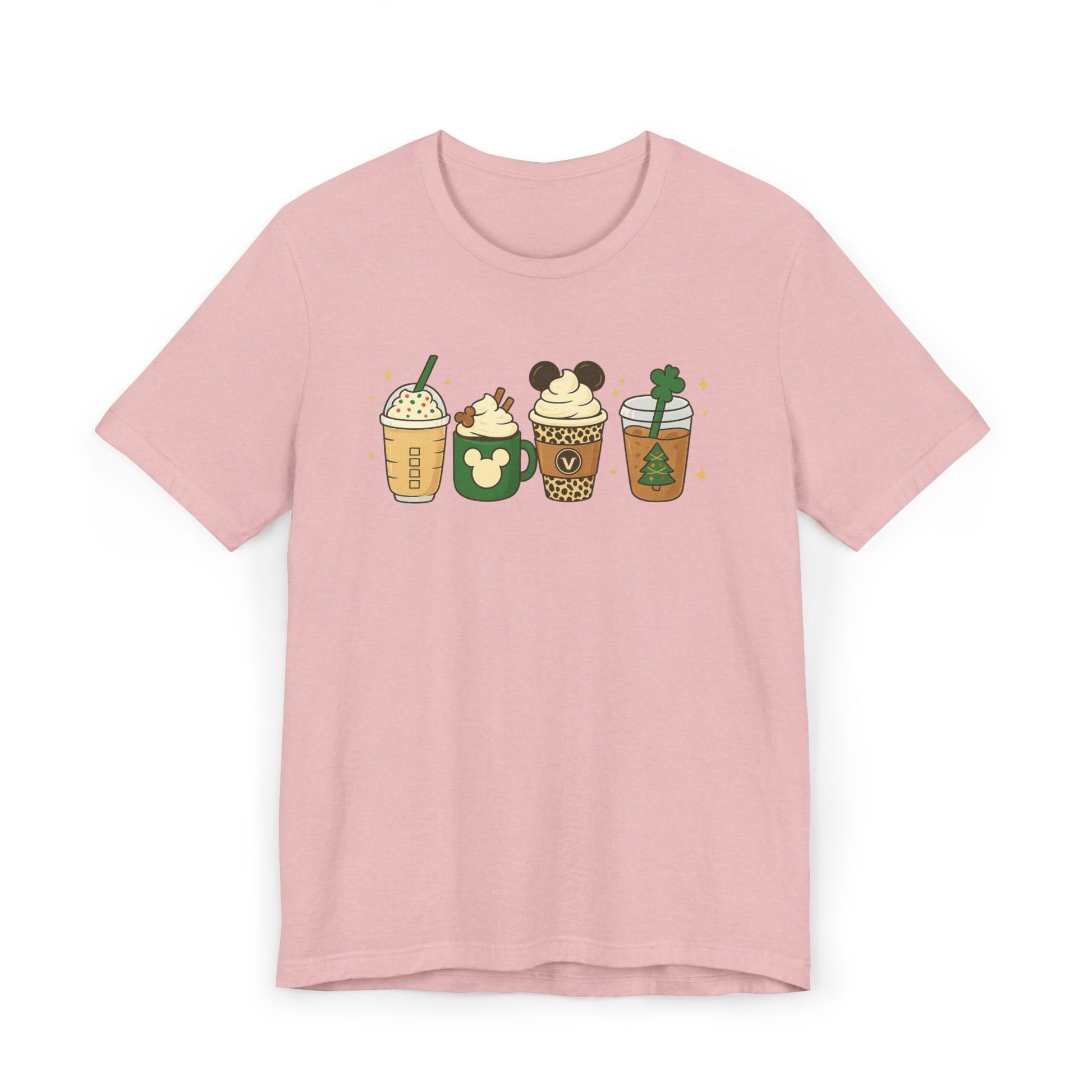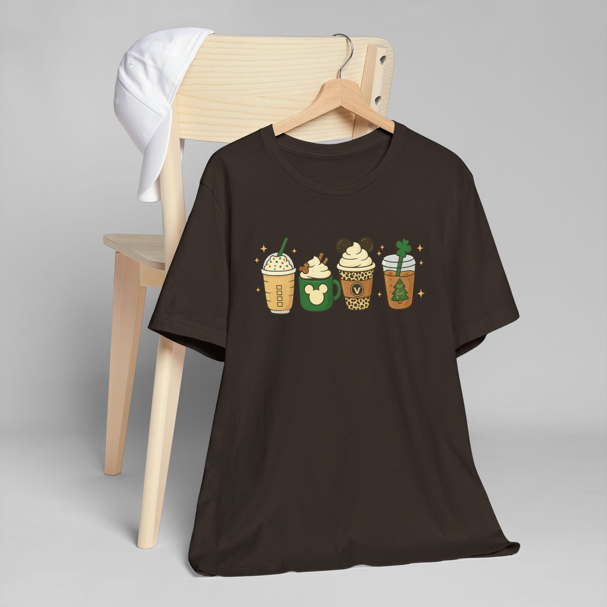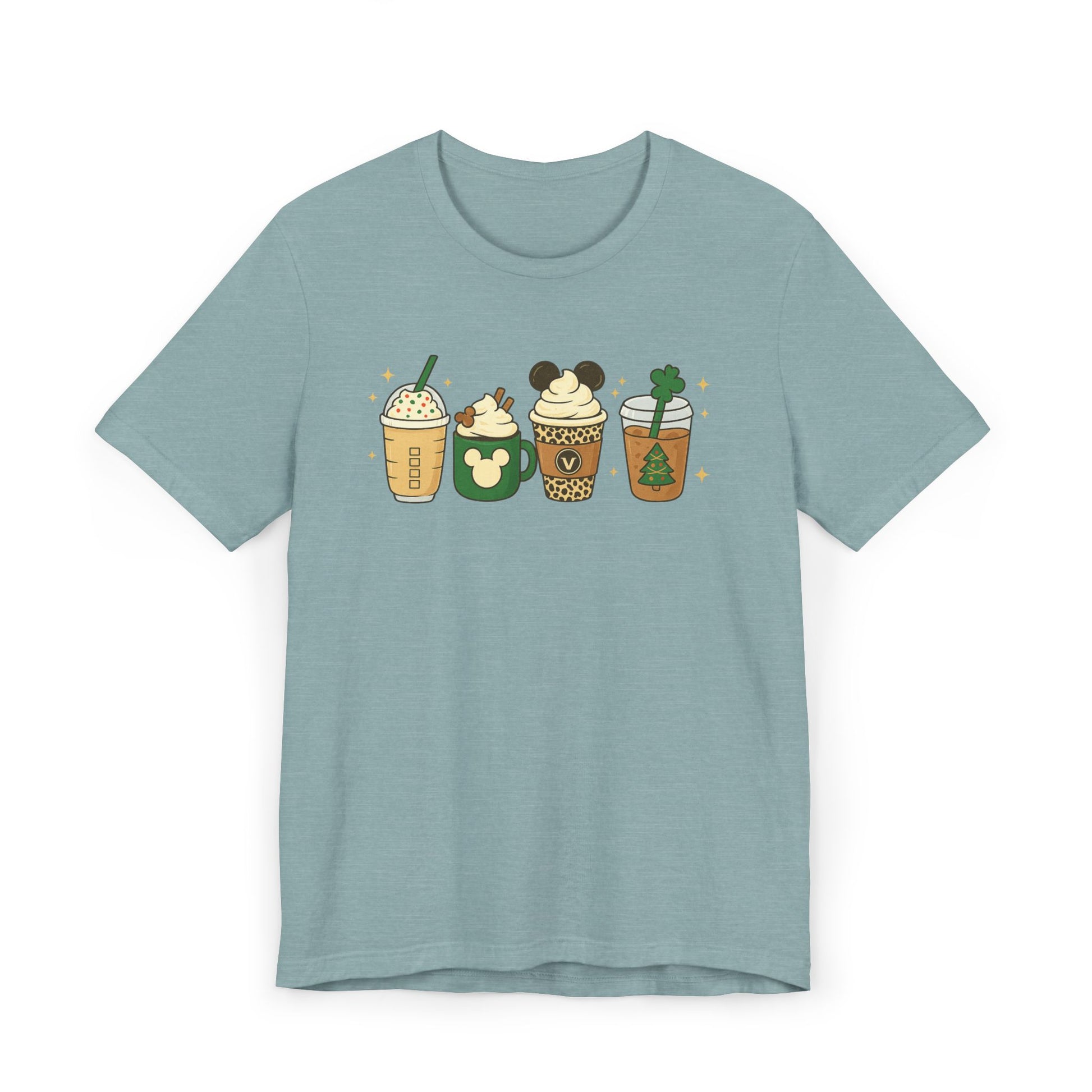 This Holiday Coffee Cups Tee celebrates the season with a playful lineup of festive coffee drinks. From peppermint lattes to Christmas cappuccinos, each cup captures the joy of coffee and holiday spirit.