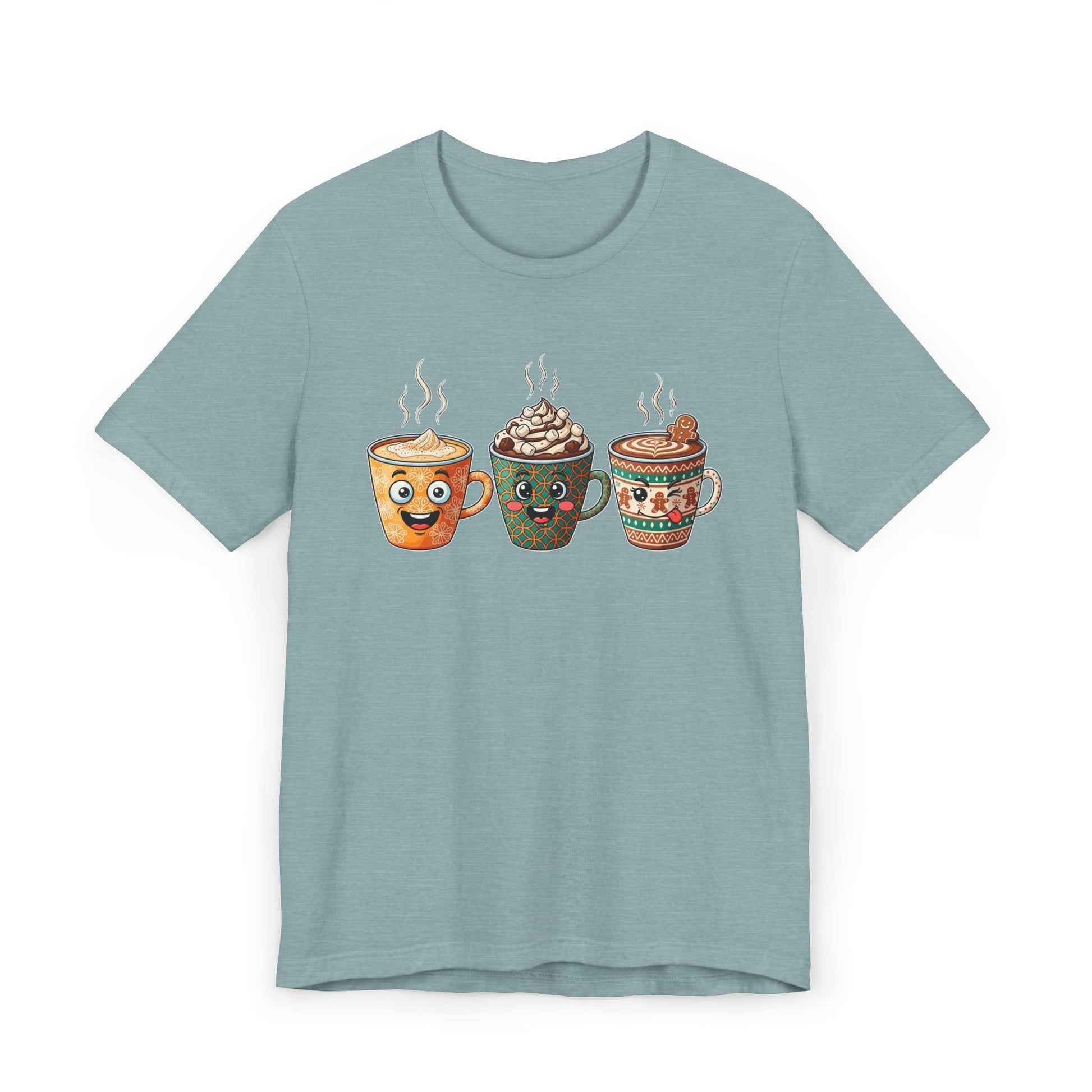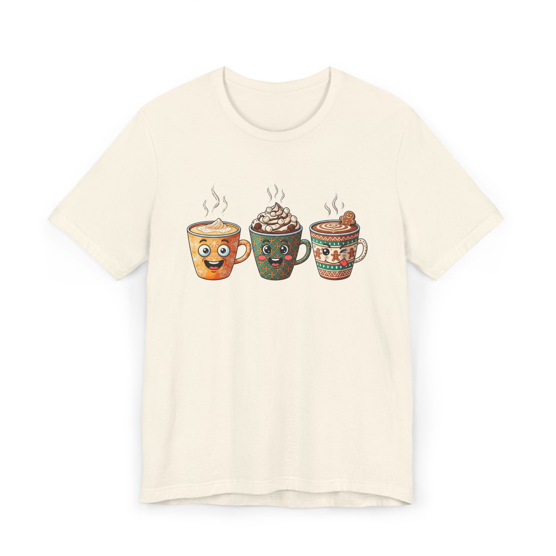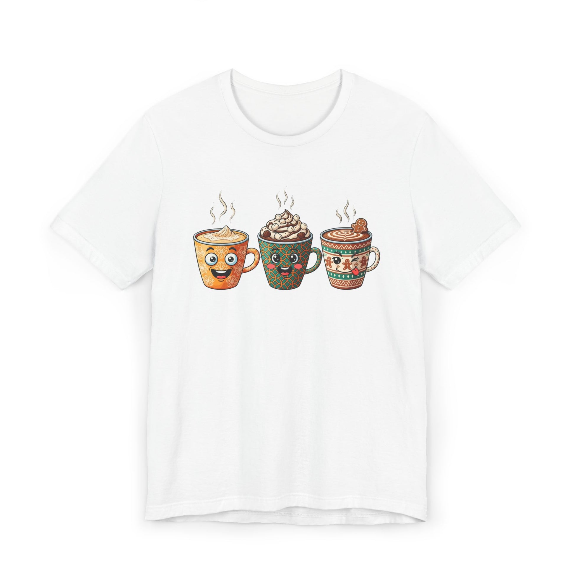 This Holiday Coffee Mugs Tee features cheerful, smiling cups of coffee and cocoa, each with holiday-themed designs that bring joy to the season.