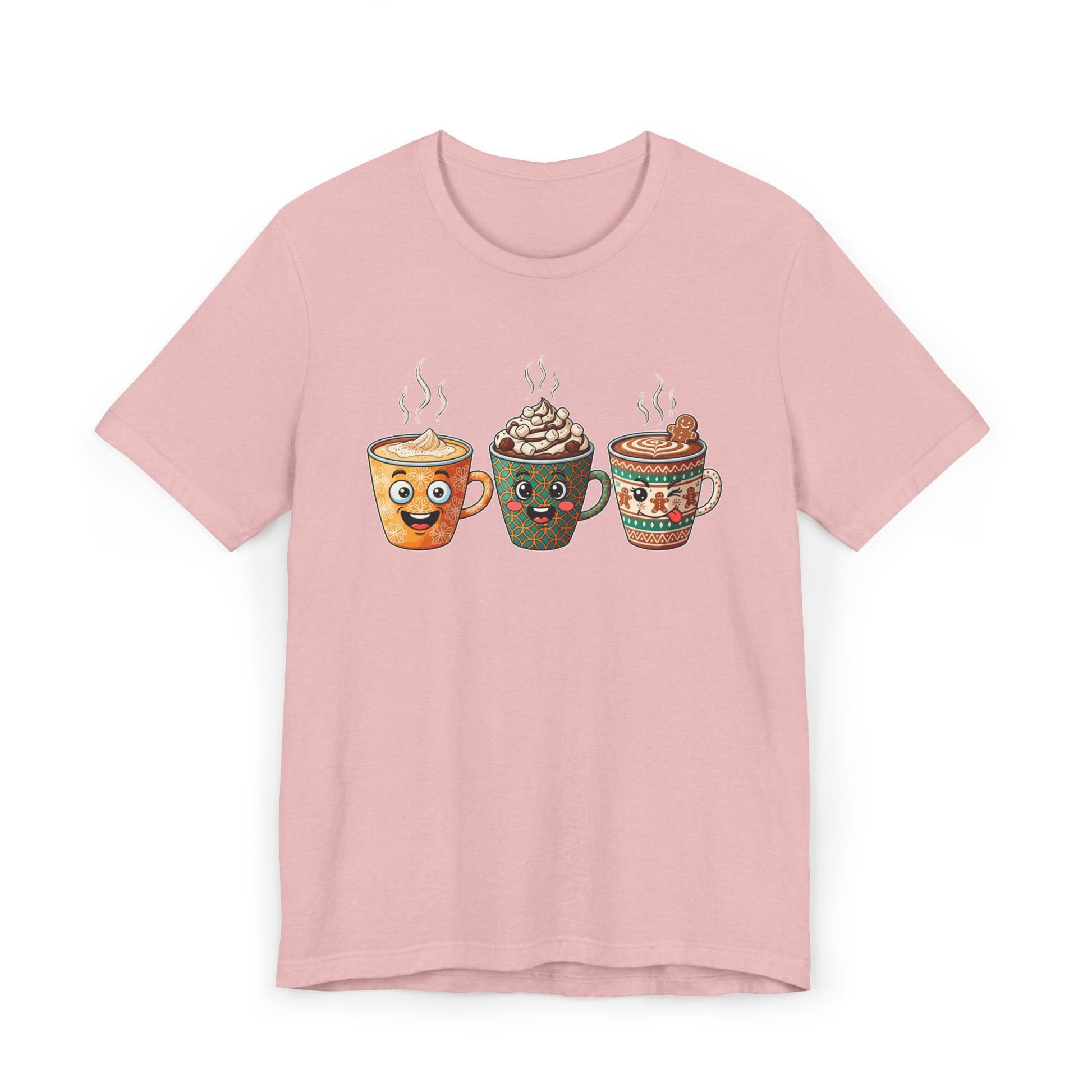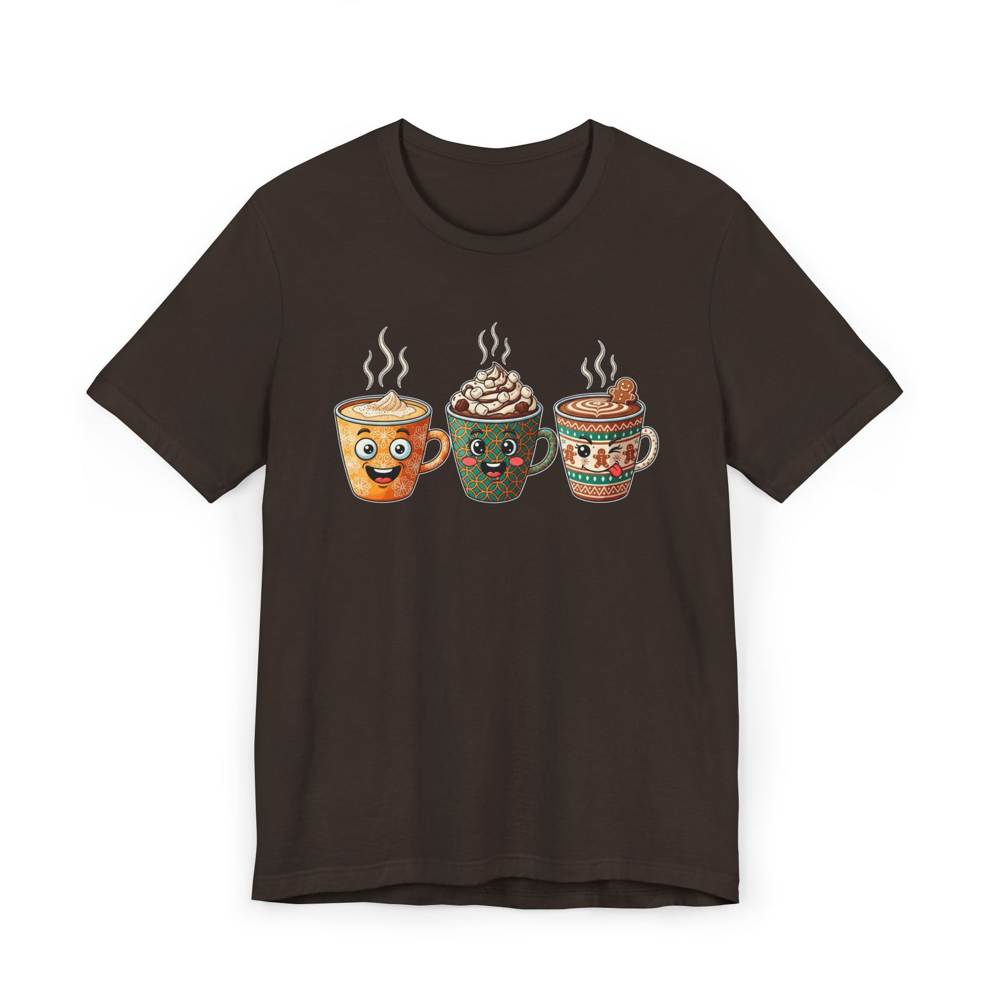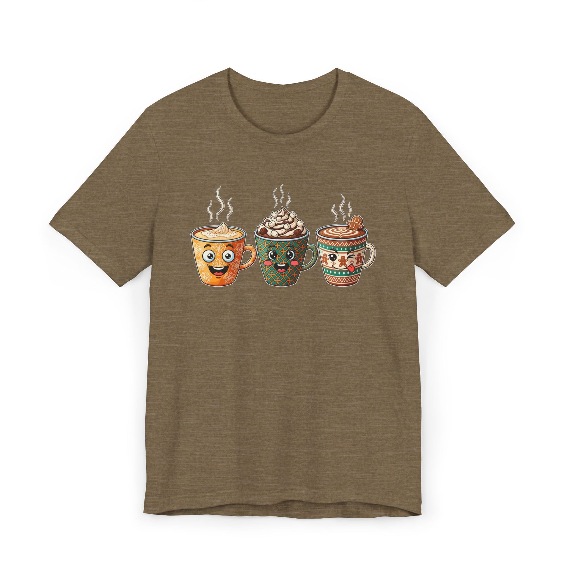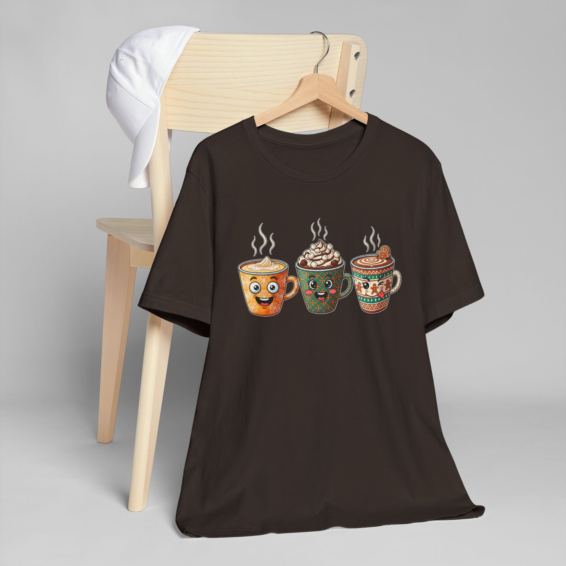 This Holiday Coffee Mugs Tee features cheerful, smiling cups of coffee and cocoa, each with holiday-themed designs that bring joy to the season.